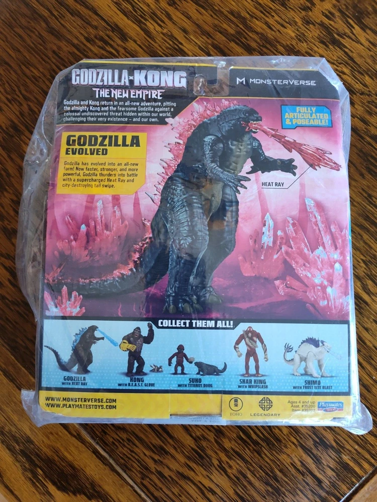 This is a limited edition, exclusive action figure of Godzilla from "Godzilla x Kong: The New Empire". Godzilla with bonus heat ray feature. Fully articulable and poseable. The figure is multicolored and comes in an exposed boxed package with additional clear bag for protection. It is recommended for ages 4 and up.