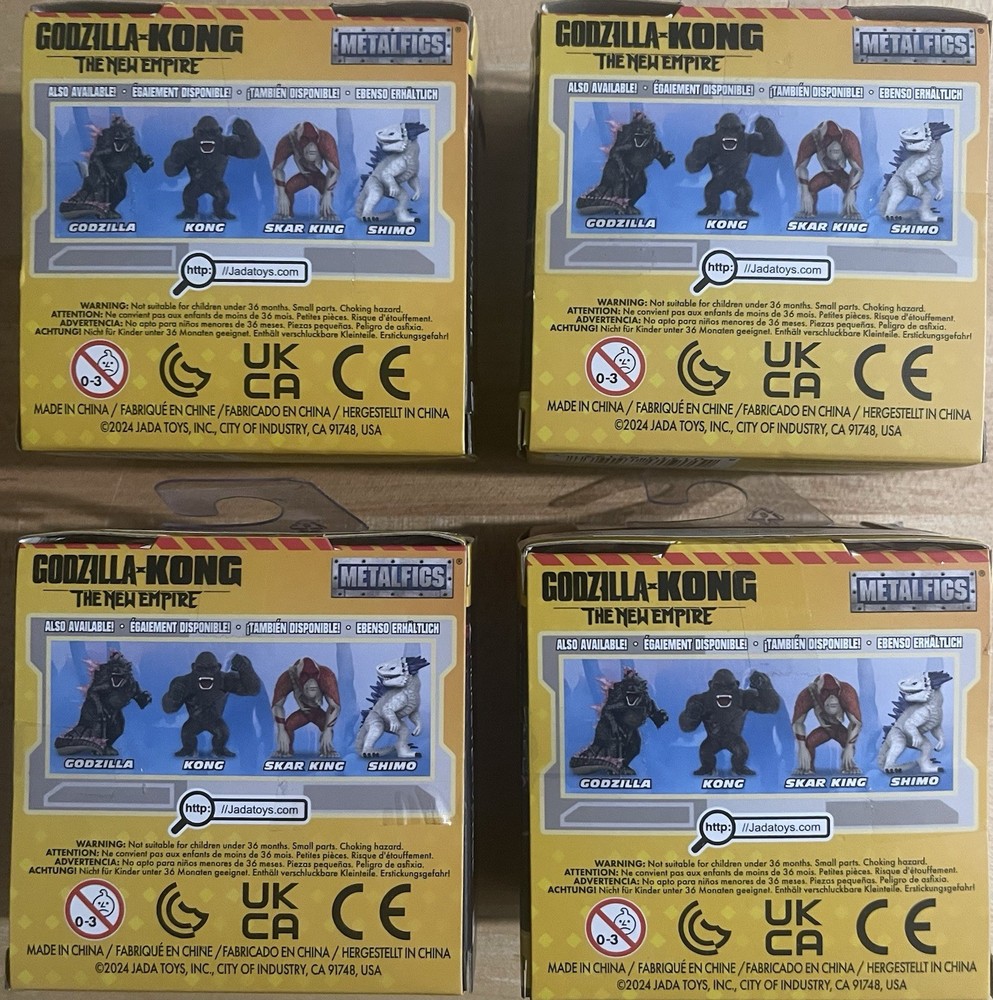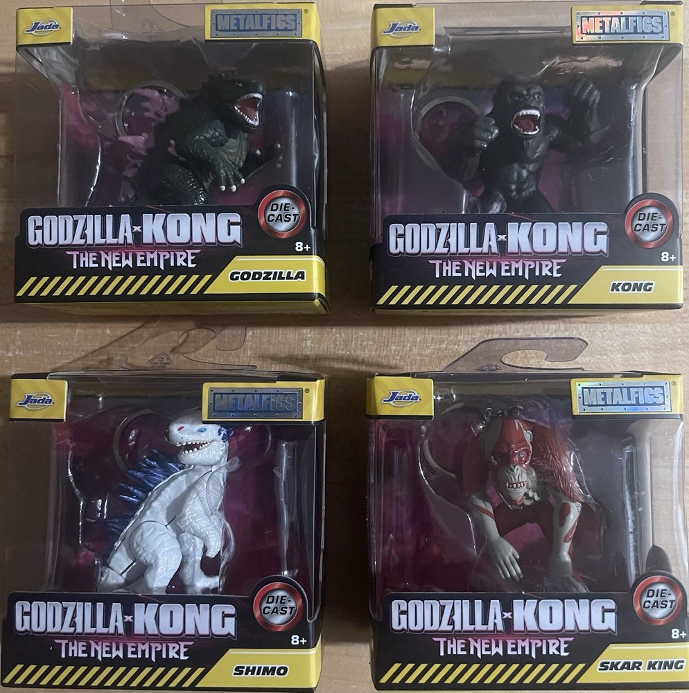 The Godzilla x Kong The New Empire JADA Metalfigs complete set of 4 is a highly collectible and sought-after toy set inspired by the Godzilla vs. Kong movie. This die-cast metal figure set features characters like Godzilla, Shimo, Skar King, and King Kong in their black color scheme. With a height of 2.5 inches, these Metalfigs are a must-have for fans of the Godzilla x Kong franchise. Made by Jada Toys and part of the Godzilla vs Kong series, these figures are perfect for TV, movie, and video game enthusiasts.