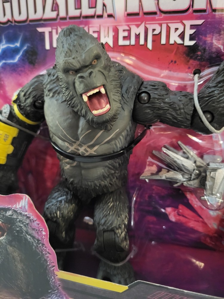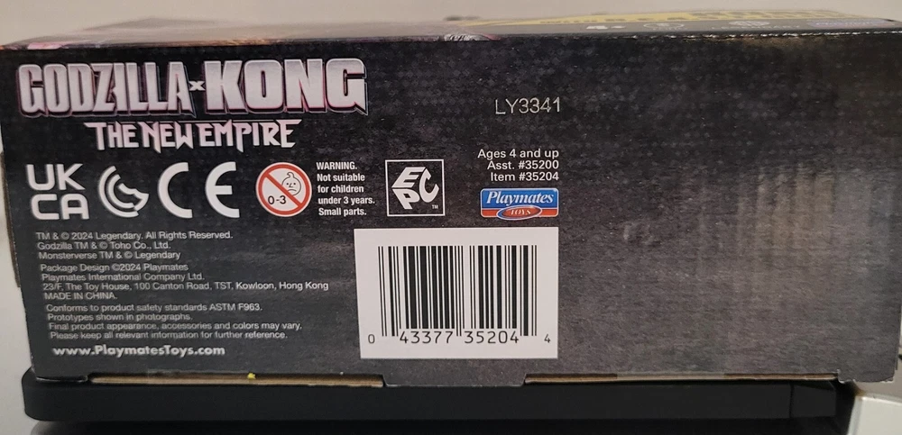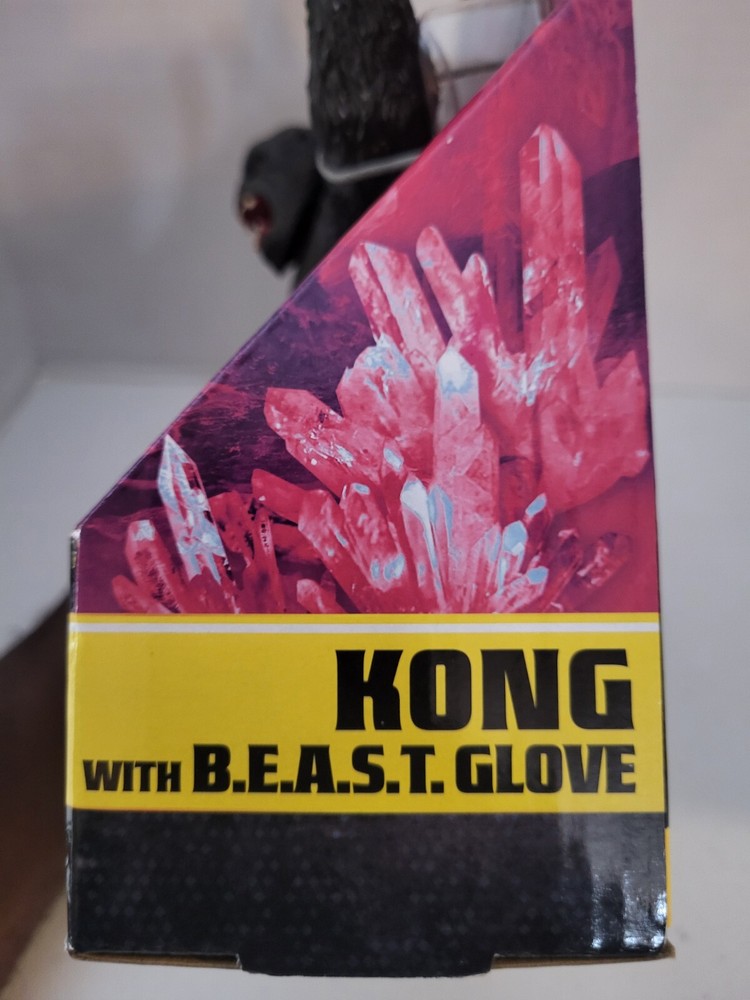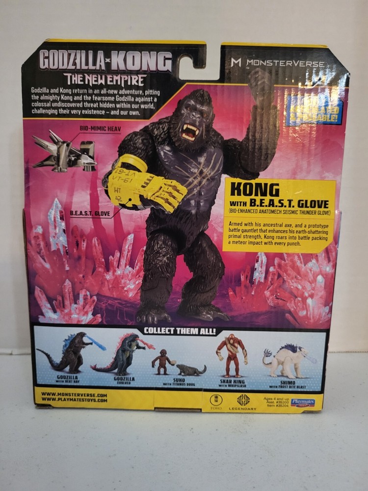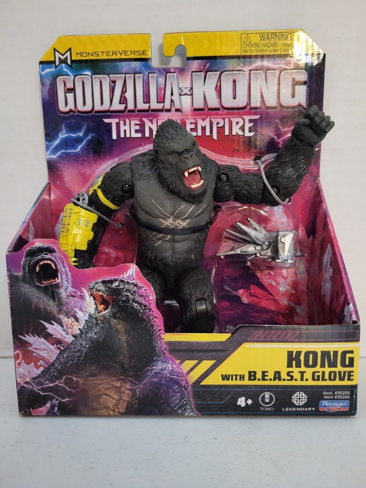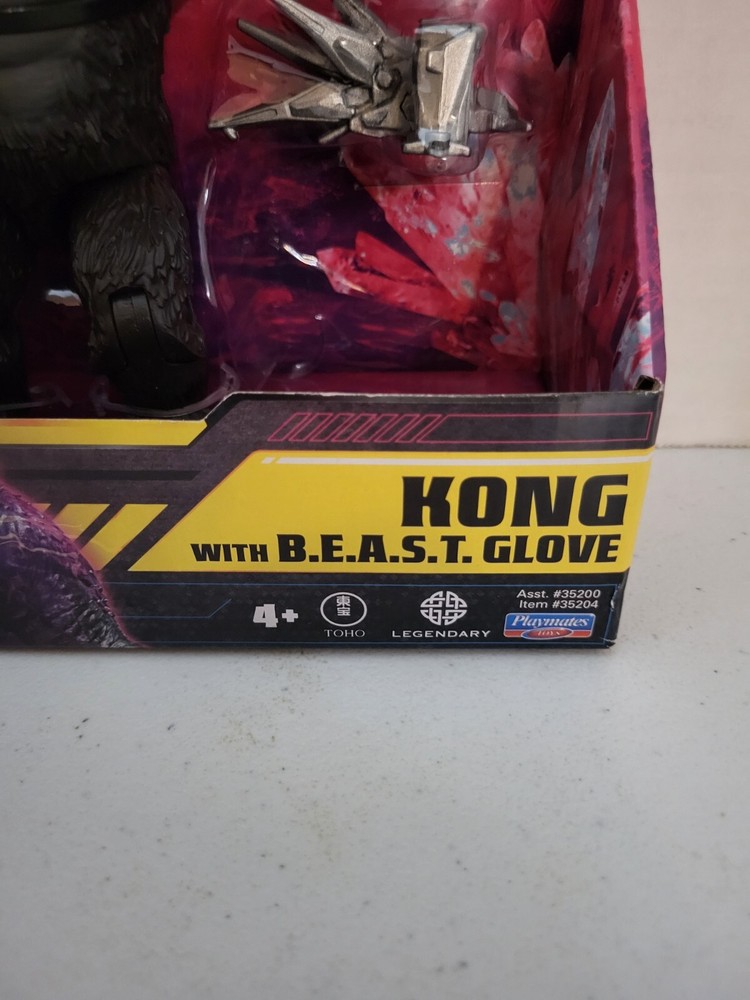 This is a new toy called "Kong With B.E.A.S.T. Glove. " It features the character Kong from the movie "Godzilla vs. Kong" wearing a B.E.A.S.T. glove bio enhanced anatomech seismic thunder glove. The toy is recommended for children aged 4 and up. The brand is Playmate, and it was manufactured in China.