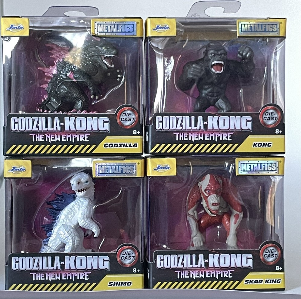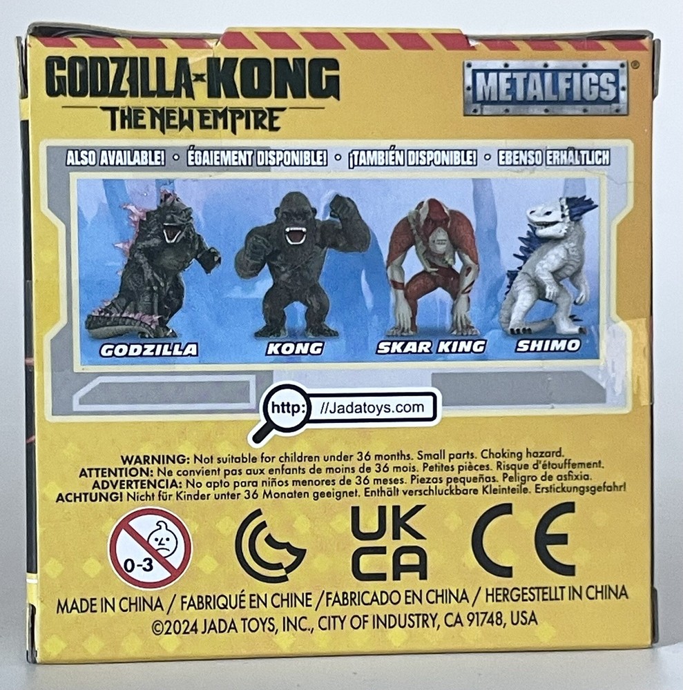 The "Godzilla x Kong The New Empire" Metalfigs set by Jada Toys includes 4 die-cast action figures featuring characters from the movie "Godzilla vs. Kong." The set consists of Godzilla, Shimo, Skar King, and King Kong, all standing at 2.5 inches tall and 1.5 inches long. These exclusive figures are part of the Godzilla x Kong series and are manufactured for the year 2023, with a release date in 2024. Each figure showcases intricate detailing and vibrant multicolor designs, making them a must-have for fans of the Kong franchise.