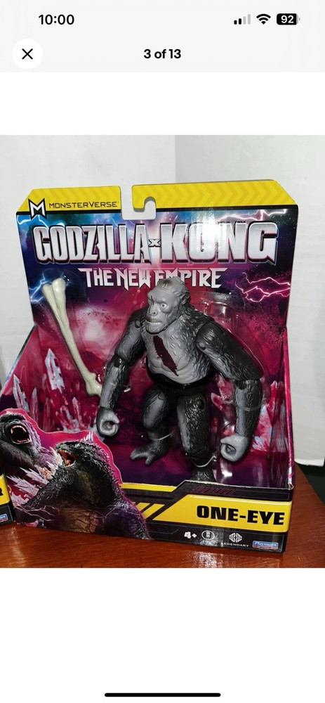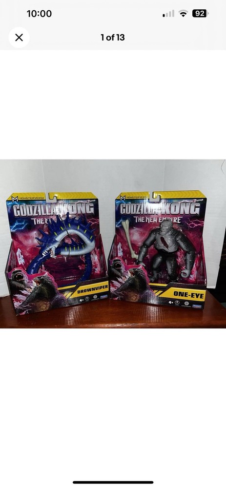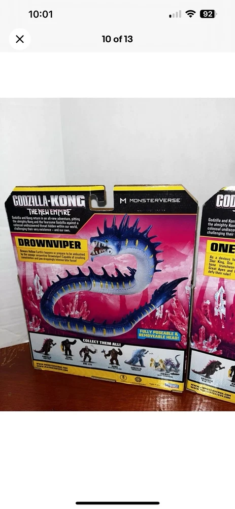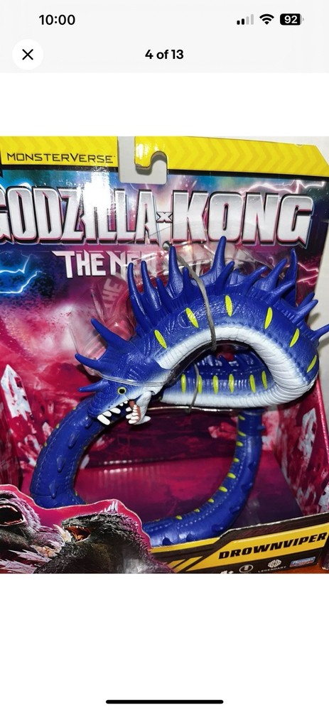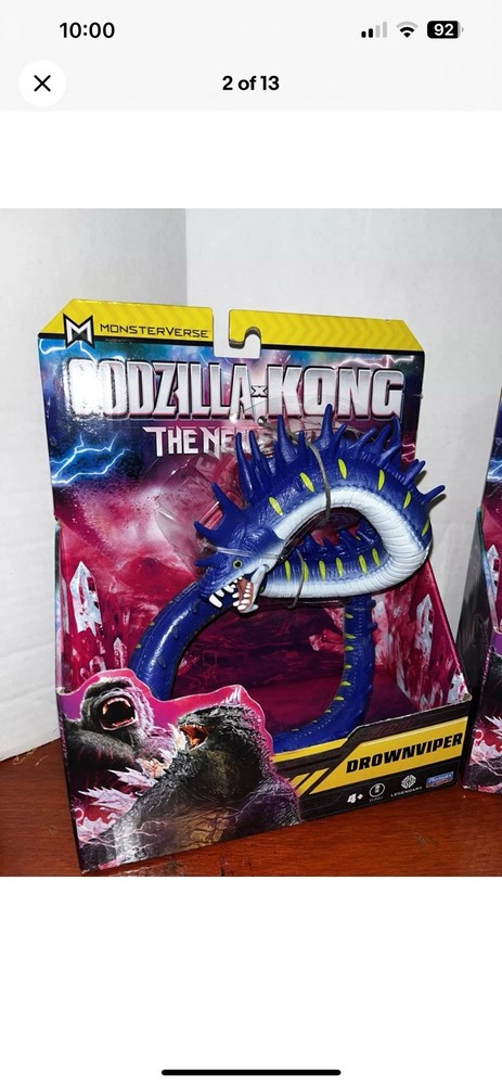 You are getting the two figures pictured! See pictures for package condition. There is minimal shelf wear. Will be shipped in a box. These are getting harder to find. The "Godzilla x Kong The New Empire ONE EYE & DROWNVIPER 7" Action Figure" set includes figures of Godzilla, Tiamat, and King Kong from the Monsterverse franchise. Made of plastic and in a 1:12 scale, this 2-figure set is part of the Playmates brand and was manufactured in 2024. The figures stand at 7 inches tall and feature a multicolor design, representing characters from the Godzilla x Kong movie "The New Empire."