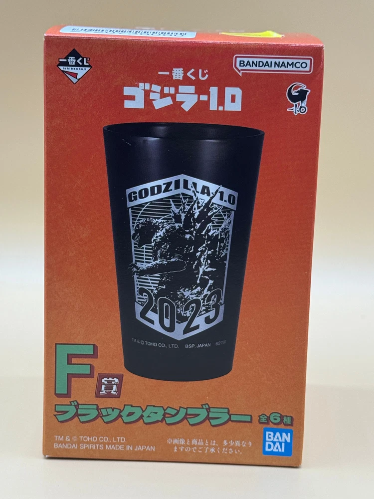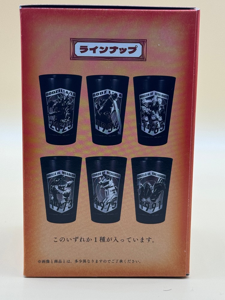 With the release of Godzilla -1.0 in Japan, Bandai executed yet another fun Ichibankuji lottery - everyone wins but not everyone wins the same thing! Prize F was a blind box featuring one of six variants of a 5" tall plastic tumbler cup. Each cup is black with a silver emblem of a popular Godzilla movie; the variants are: Godzilla -1.0 Godzilla vs. King Ghidorah Terror of Mechagodzilla Godzilla vs. Megalon Invasion of Astro-Monster Godzilla (1954) Your blind box will include one of these options; we do not open up the boxes to pick specific cups. Comes in original box.