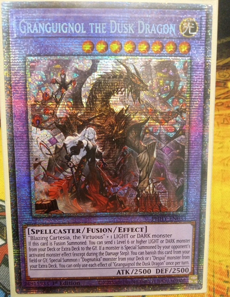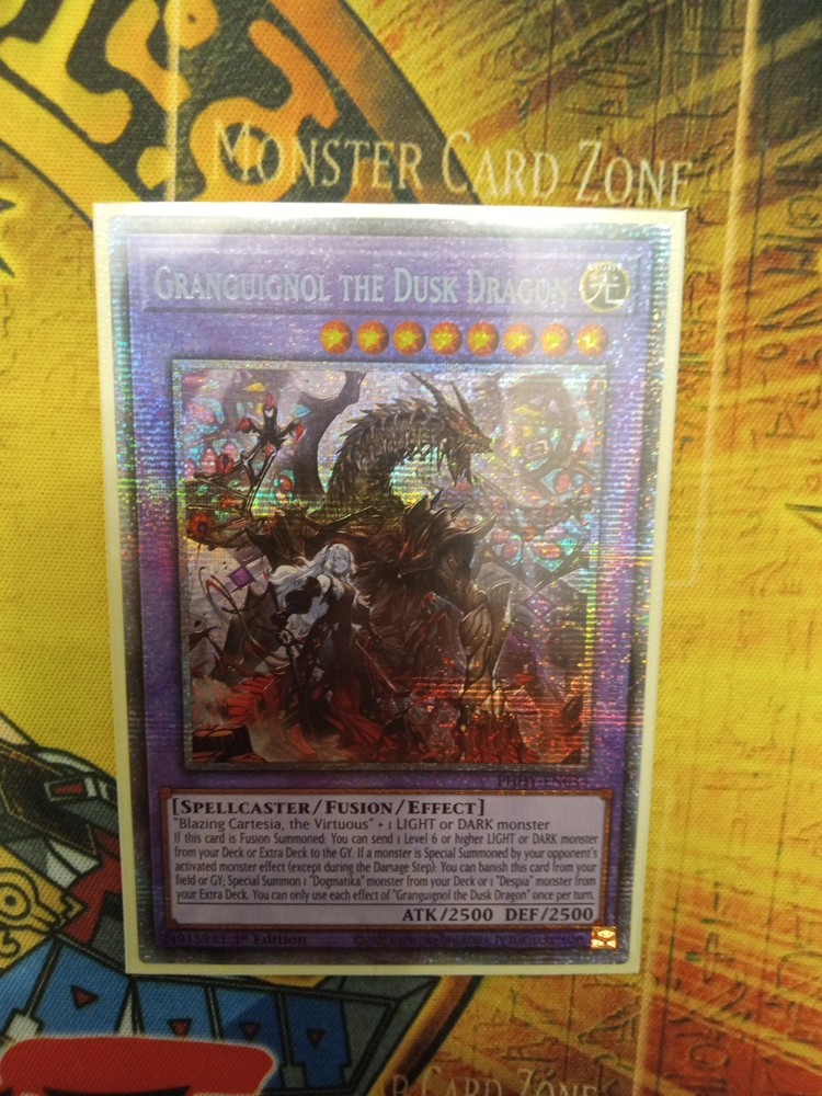 | Card Text | "Blazing Cartesia, the Virtuous" + 1 LIGHT or DARK monster If this card is Fusion Summoned: You can send 1 Level 6 or higher LIGHT or DARK monster from your Deck or Extra Deck to the GY. If a monster is Special Summoned by your opponent's activated monster effect (except during the Damage Step): You can banish this card from your field or GY; Special Summon 1 "Dogmatika" monster from your Deck or 1 "Despia" monster from your Extra Deck. You can only use each effect of "Granguignol the Dusk Dragon" once per turn. |