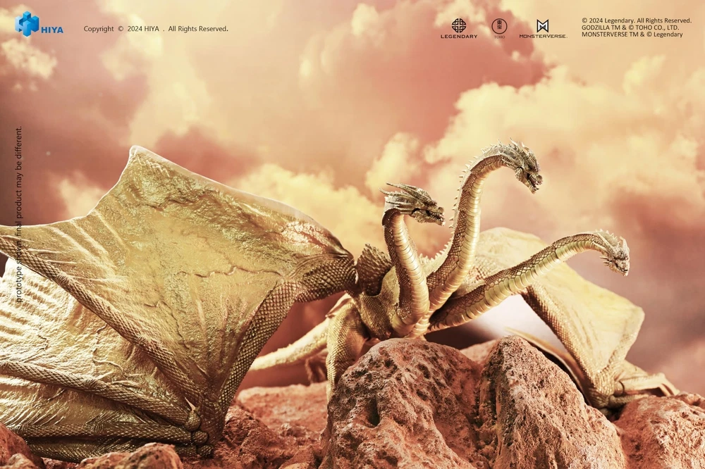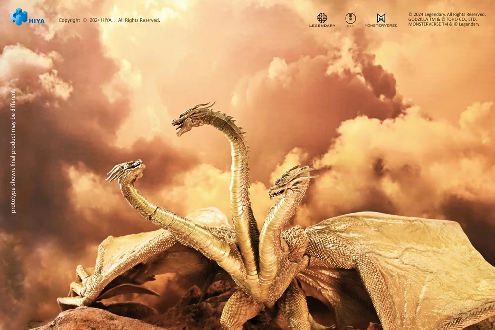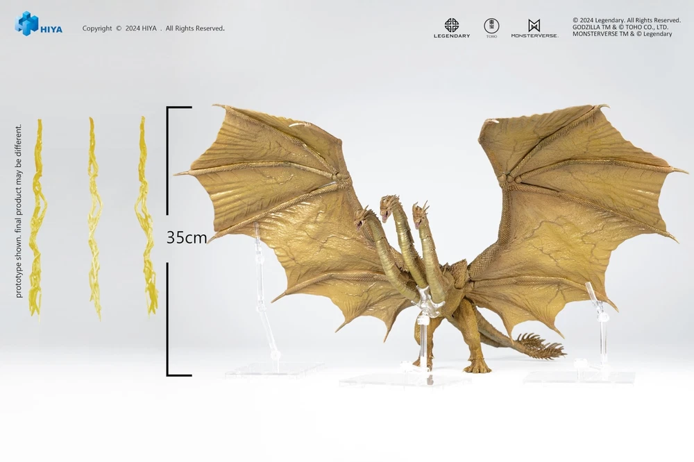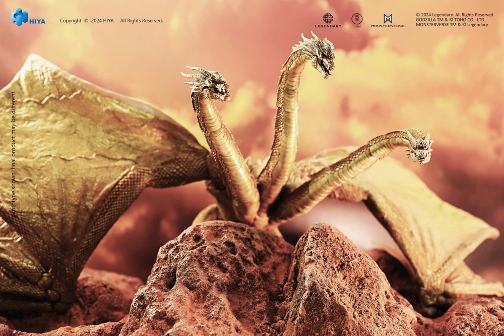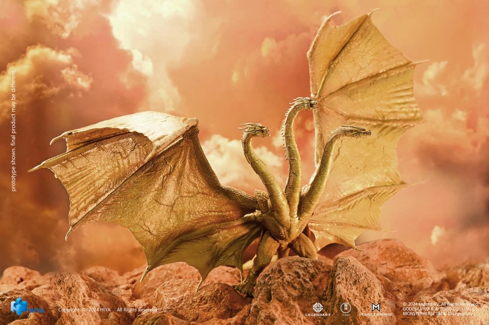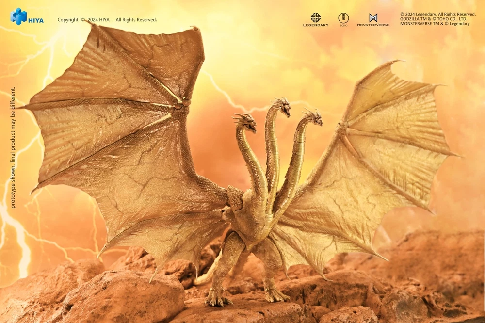 Hiya Toys Godzilla: King of Monsters – King Ghidorah with Gravity Beam Basic Series Previews Exclusive Action Figure Product Details Product Dimensions: 16 x 13 x 9 inches Item Weight: 2.9 pounds Country of Origin: China Item model number: HIYAEBG0077 Manufacturer recommended age: 15 years and up Release date: October 16, 2024 Manufacturer: Hiya Toys From the 2019 film Measures 13.7 tall with a wingspan of 22 Offers numerous pose options with its multiple joints Includes Gravity Beam effect parts From Hiya Toys. A PREVIEWS Exclusive! Introducing the mighty King Ghidorah from Godzilla: King of the Monsters (2019), as part of the Hiya Exquisite Basic collection! This formidable figure faithfully represents Ghidorah's imposing presence, featuring multiple layers of metallic golden paint and intricate details across its three head sculpts. Standing at 13.7" tall with an incredible wingspan of 22", it offers numerous pose options with its multiple joints. Included are three Gravity Beams effect parts, allowing fans to recreate Ghidorah's iconic battle poses from the film with stunning accuracy!