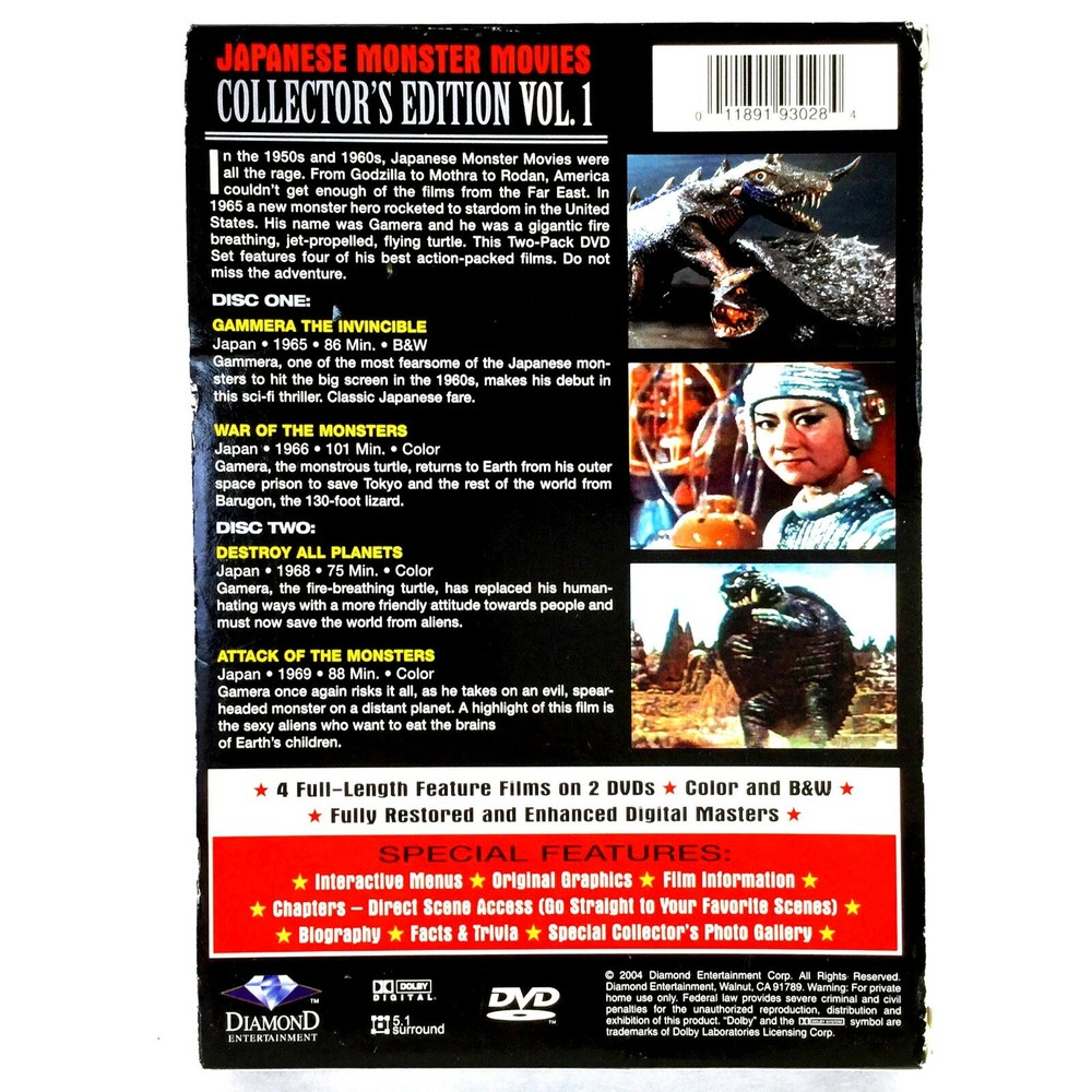 PLEASE READ INFORMATION & CAREFULLY REVIEW ALL PHOTOS ! Authentic, * Good Condition 2-Disc DVD Box Set of "Japanese Monster Movies Collector's Edition - Volume 1 (1965)" ! w/ Slip Box ! Includes The Original (4) Films: "Gammera the Invincible (1965)" , "War of the Monsters (1966)" , "Destroy All Planets (1968)" & "Attack of the Monsters (1969)" ! Total Running Time Approximately 326 Minutes ! * The DVD Outer Slip Box And Individual DVD Cases May Have Some Minor Shelf Wear ! Sold "As- Is" ! ( please carefully review all photos ) Please Take A Look At My Other Listings Including Many Rare, Unopened DVD 's And Blu-Ray's ! I strive to ship very quickly, usually within 24 hours after payment is received (check my feedback). You will also automatically receive a tracking number for your package ! I package very carefully and use Bubble, Padded, Poly or Kraft Paper envelopes and will ship USPS Media Mail for most DVD' s & Blu-Rays. * Please Contact Me First Before Purchasing For Additional Cost For Extra Padding, Cardboard Protection And/ Or Shipping In A Box ! Sorry, but I do not ship internationally and ask that you please feel free to contact me with any questions!