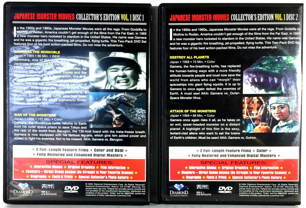 This is a must-have for kaiju fans! The 2-DVD set includes four classic Japanese monster films in good condition, complete with the original slip box. Gammera and the other films deliver cheesy, action-packed fun with giant monsters battling it out. The discs play perfectly, and while there’s minor shelf wear, it’s a fantastic deal for vintage tokusatsu lovers. Highly recommended for collectors!