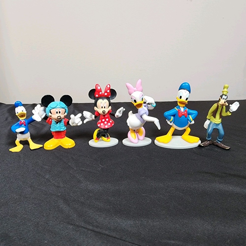 Lot of 7 collectible Disney character figures by Just Play. Includes Donald Duck, Mickey Mouse (pilot outfit), Minnie Mouse, Daisy Duck, another version of Donald Duck with base, Goofy, and a stylized Mickey with damage to the nose. Figures are preowned and have visible scuffing and paint wear, especially on Mickey, Minnie, and Goofy. Some bases are marked "Disney." Please see pics for condition. If you are purchasing multiple items from us, please email or message us before checking out so we can give you a combined shipping quote! characters: Mickey Mouse, Minnie Mouse, Donald Duck, Daisy Duck, Goofy brand: Just Play / Disney material: plastic style: cartoon figurines