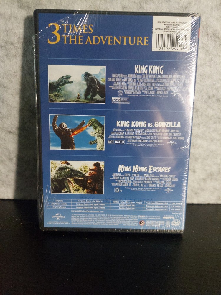 Experience the thrill of classic monster battles with the "King Kong 2005, King Kong Vs Godzilla, & King Kong Escapes 3 DVD Set." Journey through gripping narratives and stunning visual spectacles directed by Peter Jackson, with a cast including Andy Serkis, Jack Black, and Adrien Brody. This set encompasses a variety of genres including Action, Adventure, Drama, Fantasy, and Horror, offering a diverse cinematic experience. Enjoy additional features like widescreen presentation, captioning, and the choice of English or American English audio. Relish the nostalgia and excitement of these iconic films, all housed in a sleek tall/DVD case. Whether you're revisiting these classics or discovering them for the first time, this box set promises to deliver an unforgettable viewing adventure.
