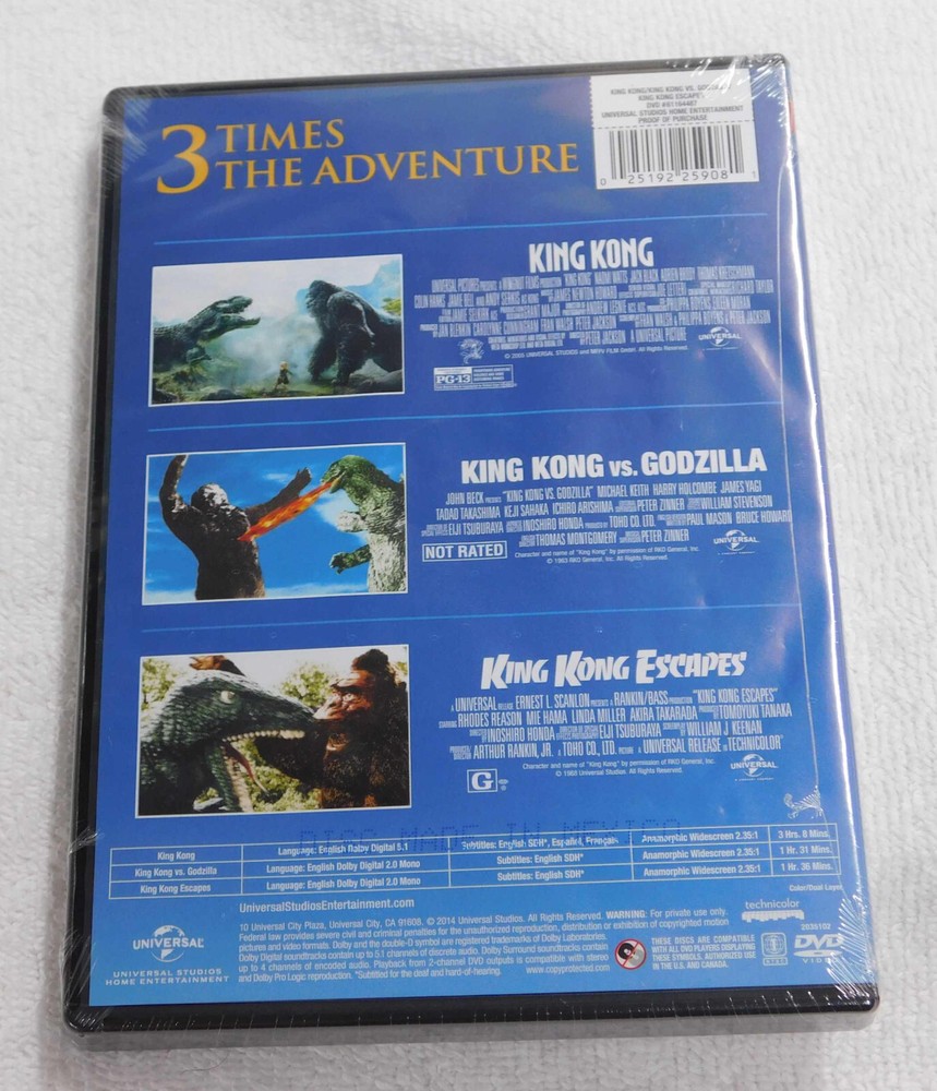 Up for purchase is King Kong 2005 / King Kong vs Godzilla 1963 / King Kong Escapes 1968 Triple Feature DVD. Any included digital copy may be Expired. This DVD is new and sealed, never opened. The packaging has shelf wear, scratching and scuffs (see photo). Check out my bad_panda store for other items! FREE USPS Ground Advantage SHIPPING to the United States! If Priority Mail (an Expedited shipping method) is chosen this DVD will be bubble wrapped and shipped in a hard cardboard Priority Mail Box for maximum protection. If USPS Ground Advantage is chosen this DVD will be shipped in a sturdy bubble envelope. This is a North American DVD , NOT an import. The photo is a picture of the DVD you will be receiving, not a stock photo . I ship USPS Mail and the price will include tracking and Delivery Confirmation and will cover shipping, handling and packaging. Feel free to e-mail me with any questions prior to bidding.