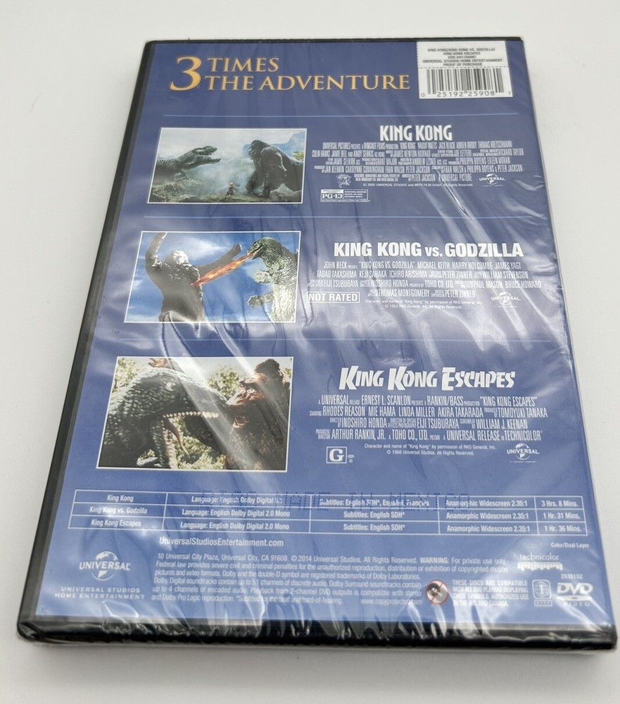 Get ready for a classic monster showdown with the King Kong vs Godzilla Triple Feature collection! This set includes three films: the Peter Jackson version of King Kong, King Kong Escapes, and the 1962 version of King Kong vs Godzilla. Relive the epic battles and giant creature action on your own screen! This DVD set is the perfect addition to any movie collection, especially for fans of monster movies and classic cinema. With top-notch special effects, memorable soundtracks, and iconic characters, King Kong vs Godzilla Triple Feature is guaranteed to entertain and thrill audiences of all ages. Features: - Three classic monster movies in one collection: Peter Jackson's King Kong, King Kong Escapes, and King Kong vs Godzilla (1962 version) - Exciting and action-packed storylines - Iconic characters and memorable soundtracks - Perfect addition to any movie collection Don't miss out on this must-have DVD set! Buy the King Kong vs Godzilla Triple Feature now and experience the epic monster battles and giant creature action for yourself. Order today! Brand new and sealed!