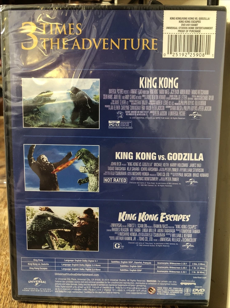 Brand new triple feature DVD set of king Kong , King Kong versus Godzilla and King Kong escapes all in widescreen and is a n only at Walmart exclusive set. Took pictures of front and back , as you know exactly what you will be getting. Comes from a smoke and pet free home. Will ship it out today, so you will get it fast.