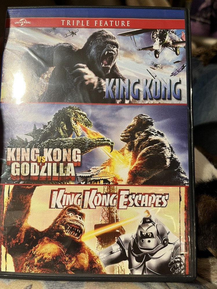 The product is a triple feature DVD collection including the movies "King Kong" (2005 film), "Vs Godzilla" (1963), and "Escapes" (1968). It has a total run time of 252 minutes and includes English and Spanish subtitles. The films are in English with a PG-13 rating, belonging to the Action genre. The aspect ratio is 1.85:1, and it was released in 2005 by Universal Pictures.