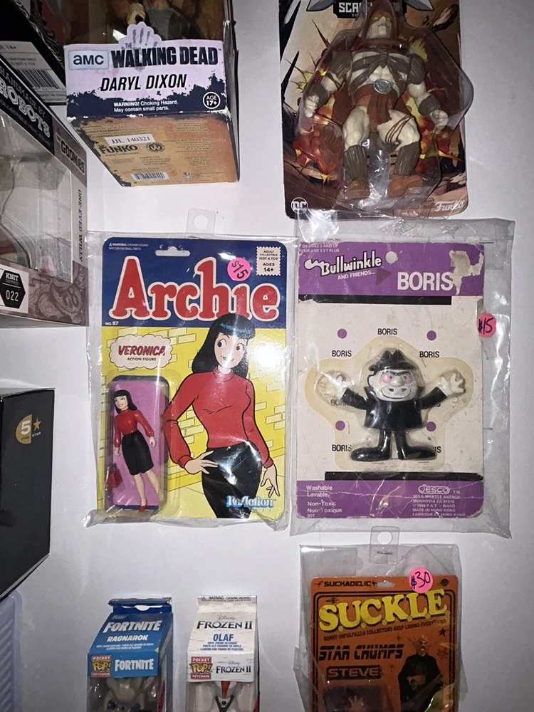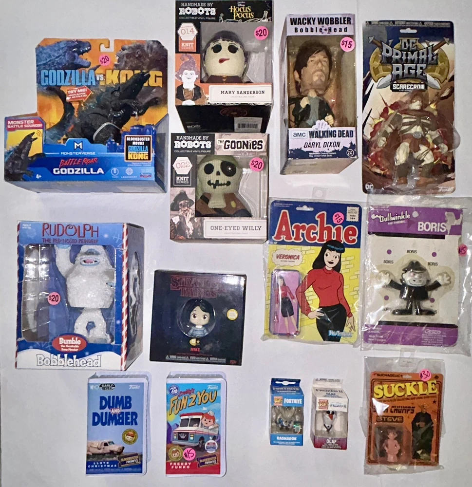 LOT OF NEW IN BOX FIGURES; GODZILLA VERONICA GOONIES HOCUS POCUS FUNKO POP KEYCHAINS DARYL WALKING DEAD FUNKO WACKY WOBBLER DC PRIMAL AGE SCARECROW BORIS VINTAGE BEND EM BUMBLE BOBBLE HEAD 2 FUNKO BLOCKBUSTER REWIND Value over $200