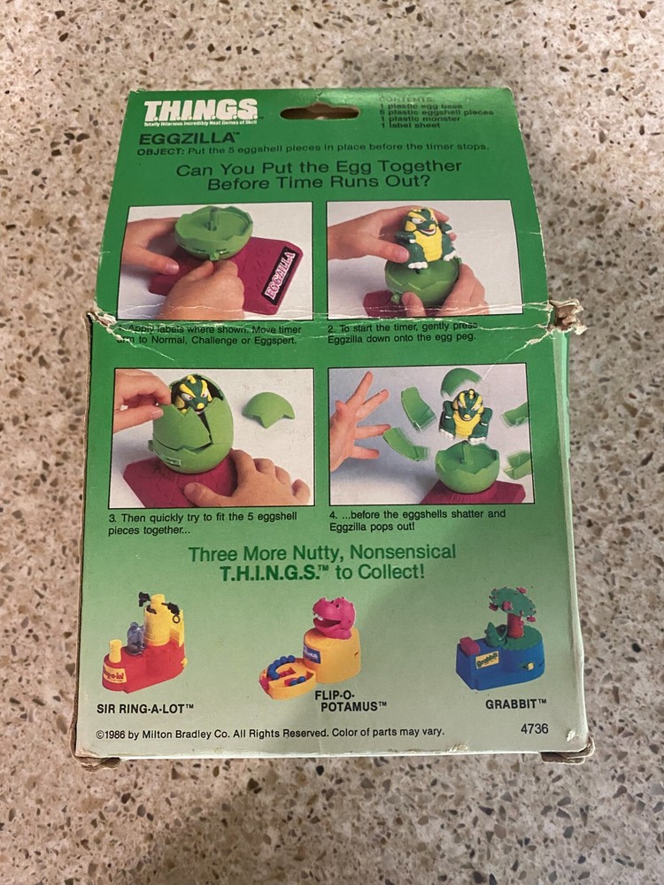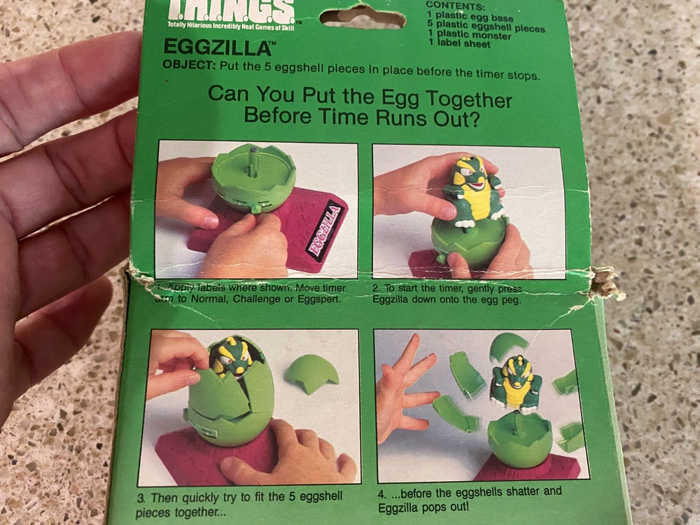 MB Things Eggzilla Skill Game Godzilla Clone Rare Vintage Boxed Game NOT WORKING. PLEASE READ PRIOR TO PURCHASING: THE GAME DOES NOT WORK. THIS PURCHASE IS FOR PARTS ONLY. The Original Box Has Wear and Tears in it and the Label has a Tear in It. See Attached Pictures for Details. SOLD AS IS. NO REFUNDS/NO RETURNS