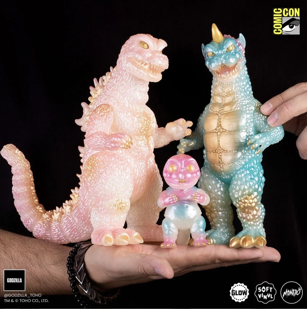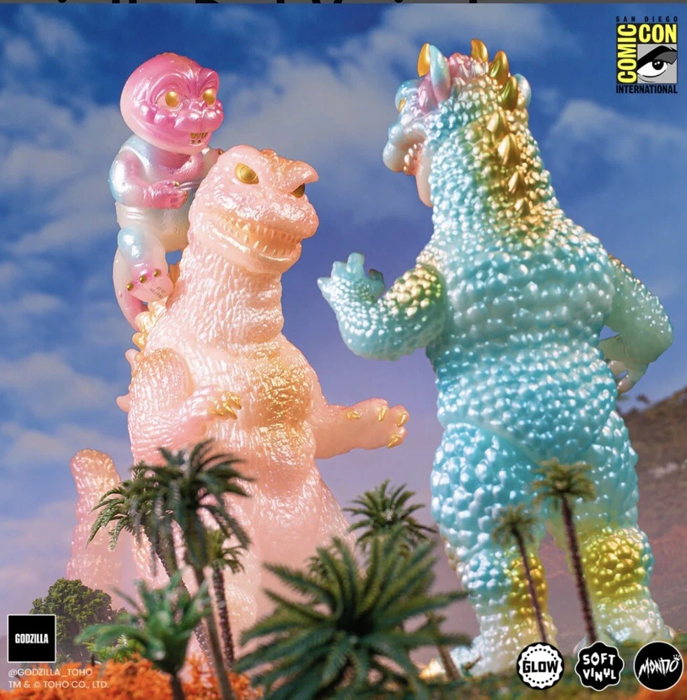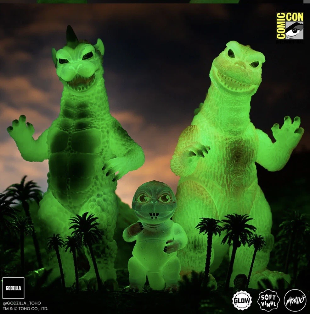 MONDO SDCC All Monsters Attack Soft Vinyl Cherry Blossom Glow In The Dark Ready to ship PRODUCT INFORMATION Edition size: 250 Height: Godzilla - 8" Gabara - 8.5" Minilla - 3.5" Material: Roto Soft Vinyl Weight: 5 lbs The ALL MONSTERS ATTACK - Soft Vinyl Figure Set is back in a signature Cherry Blossom GITD Variant! This limited edition release comes complete with three swivel-articulated kaiju Godzilla, Gabara and Minilla from Toho's 1969 film ALL MONSTERS ATTACK.