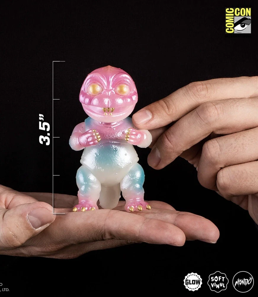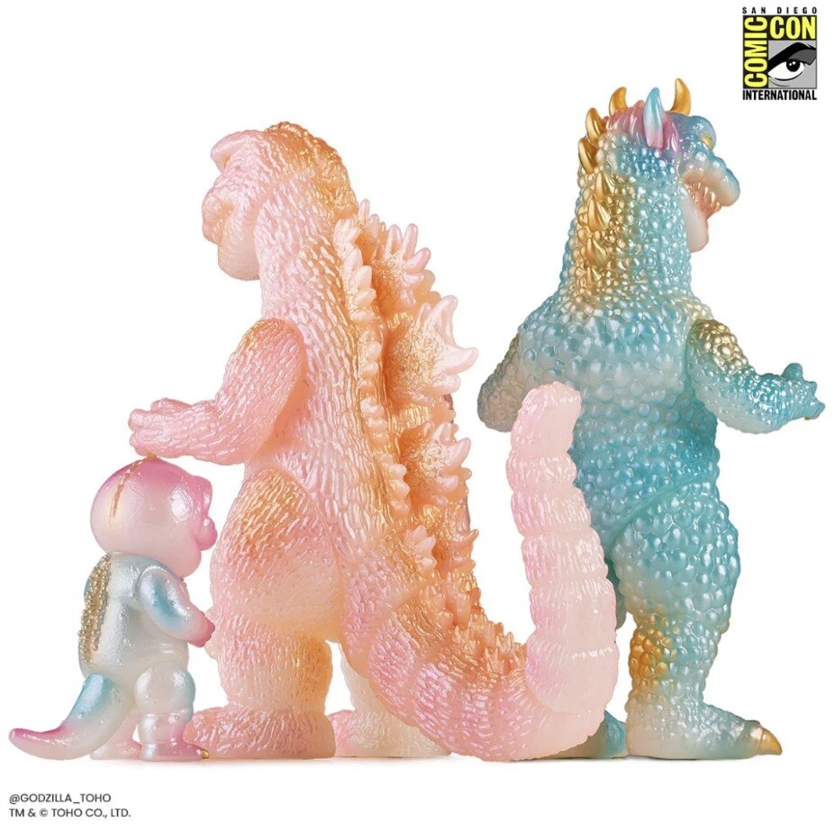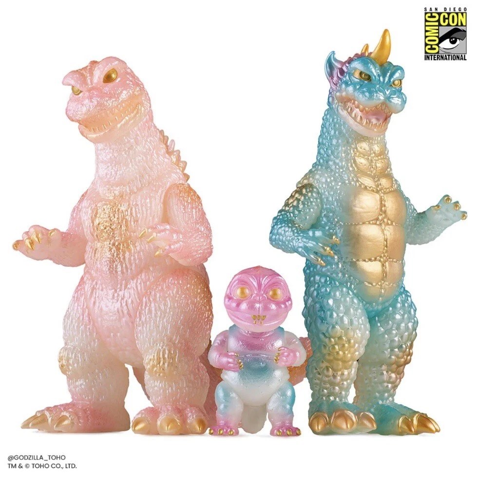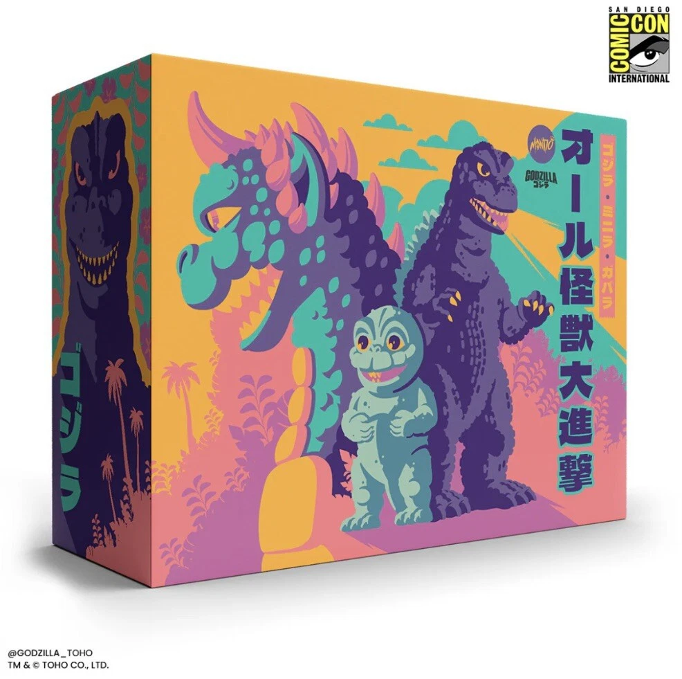 MONDO SDCC All Monsters Attack Soft Vinyl Cherry Blossom Glow In The Dark Ready to ship PRODUCT INFORMATION Edition size: 250 Height: Godzilla - 8" Gabara - 8.5" Minilla - 3.5" Material: Roto Soft Vinyl Weight: 5 lbs The ALL MONSTERS ATTACK - Soft Vinyl Figure Set is back in a signature Cherry Blossom GITD Variant! This limited edition release comes complete with three swivel-articulated kaiju Godzilla, Gabara and Minilla from Toho's 1969 film ALL MONSTERS ATTACK.