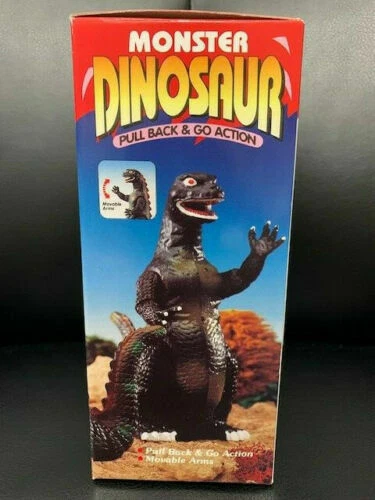 THIS IS A VINTAGE AND RARE ORIGINAL AND VINTAGE MONSTER DINOSAUR GODZILLA PULL BACK AND GO ACTION TOY. FIGURE COMES WITH THE ORIGINAL BOX WHICH IS IN TERRIFIC CONDITION . THESE ARE VERY HARD TO FIND AND THIS IS THE ONLY ONE CURRENTLY ON EBAY. AS YOU CAN SEE BY PICTURES THIS TOY AND BOX LOOK FANTASTIC. Would be awesome for display and a must for any Godzilla collection. This item is sure to rise in value as the years go by. SOLD AS IS . YOU RECEIVE EXACT ITEM YOU SEE PICTURED . Shipping will depend on where in the lower 48 US states you live and I will insure it for full amount. I only ship overseas with ebay global. Feel free to ask any questions.