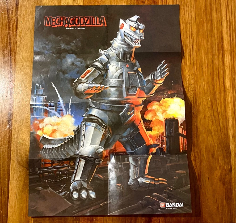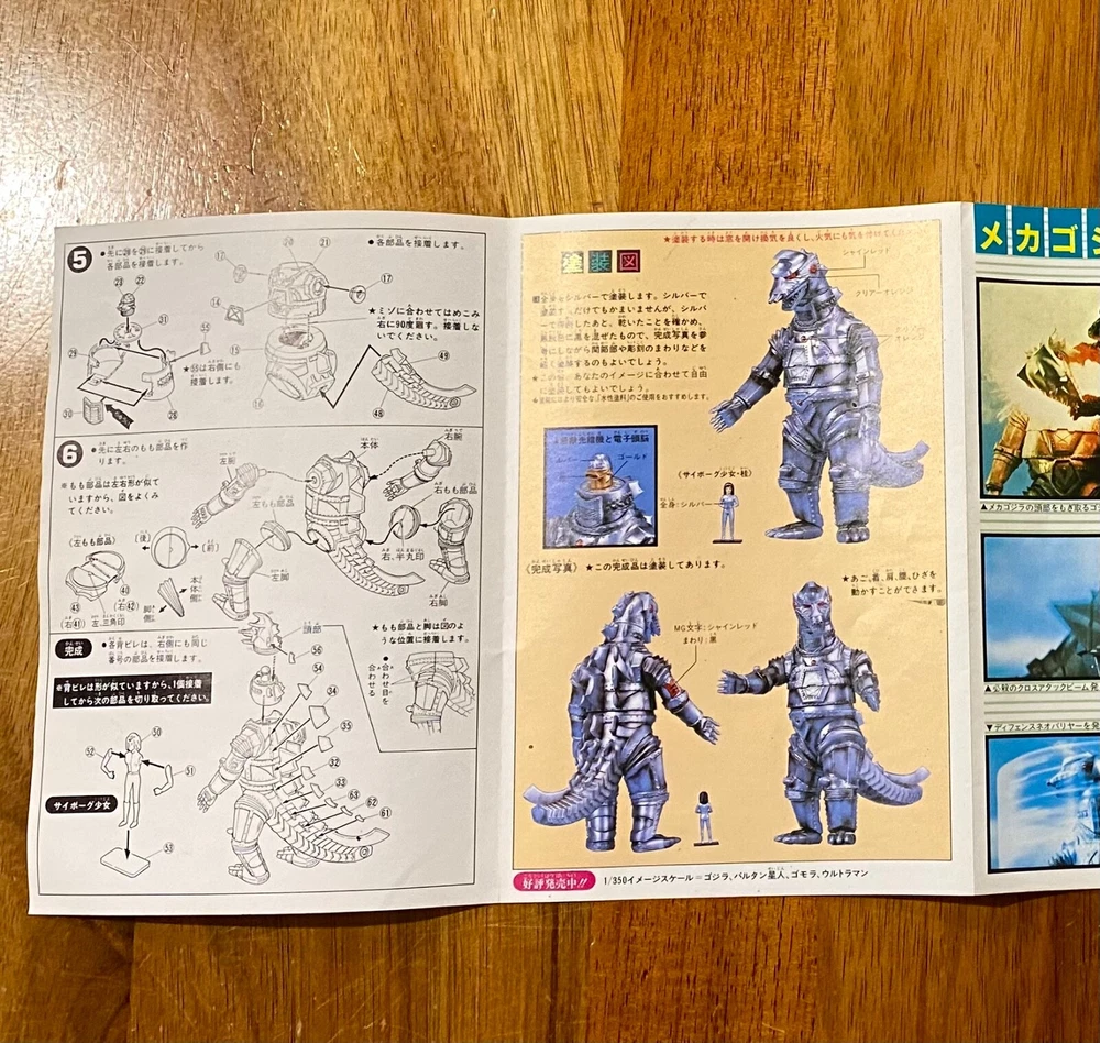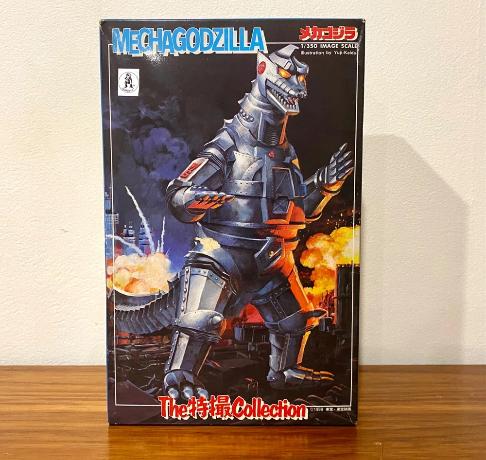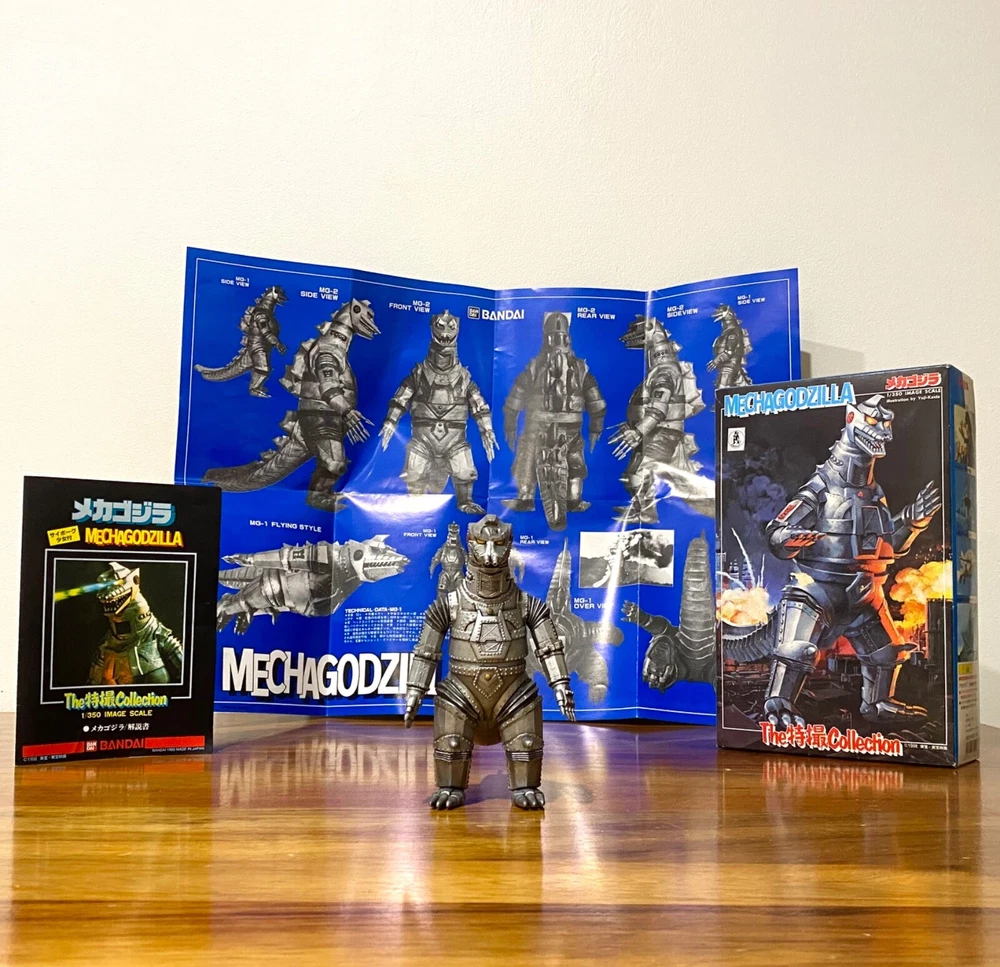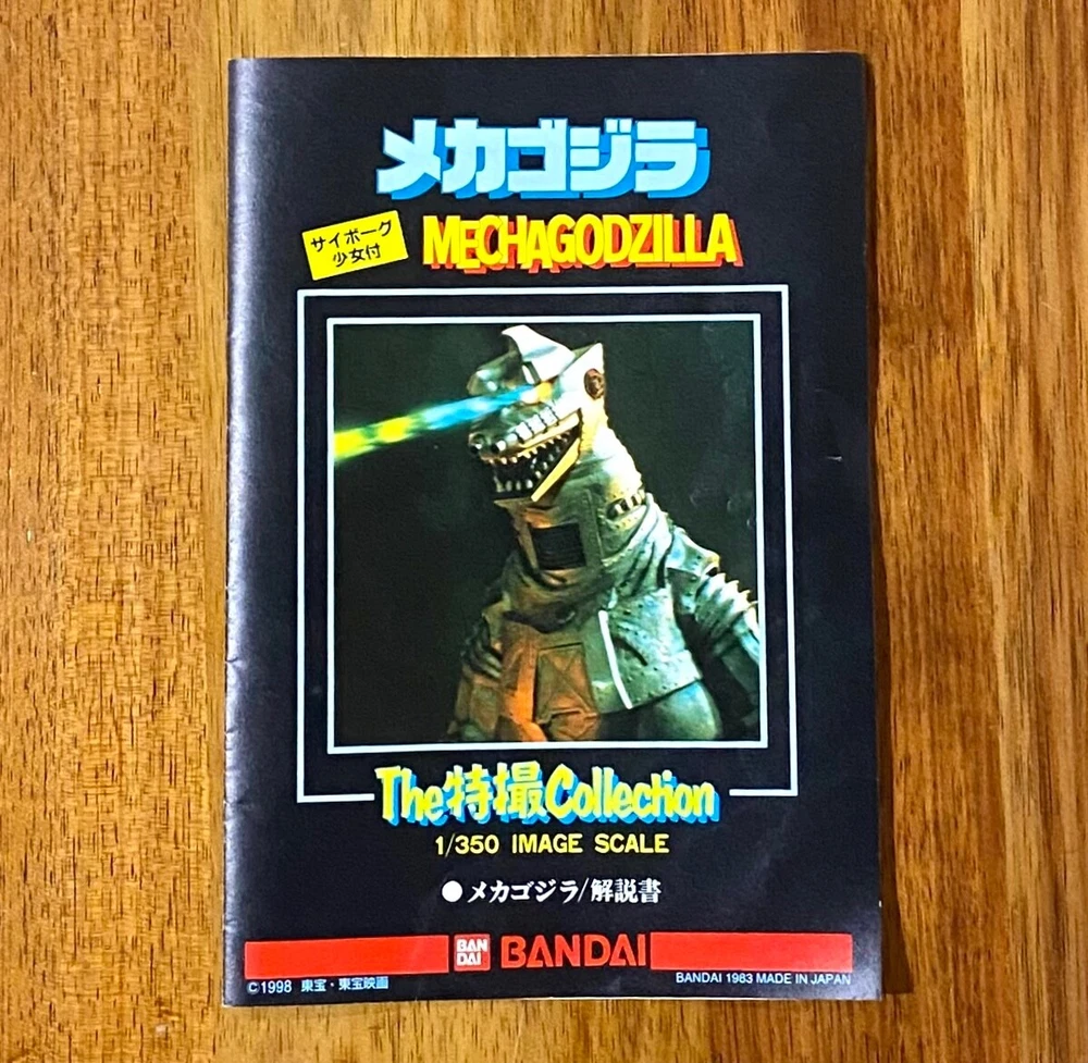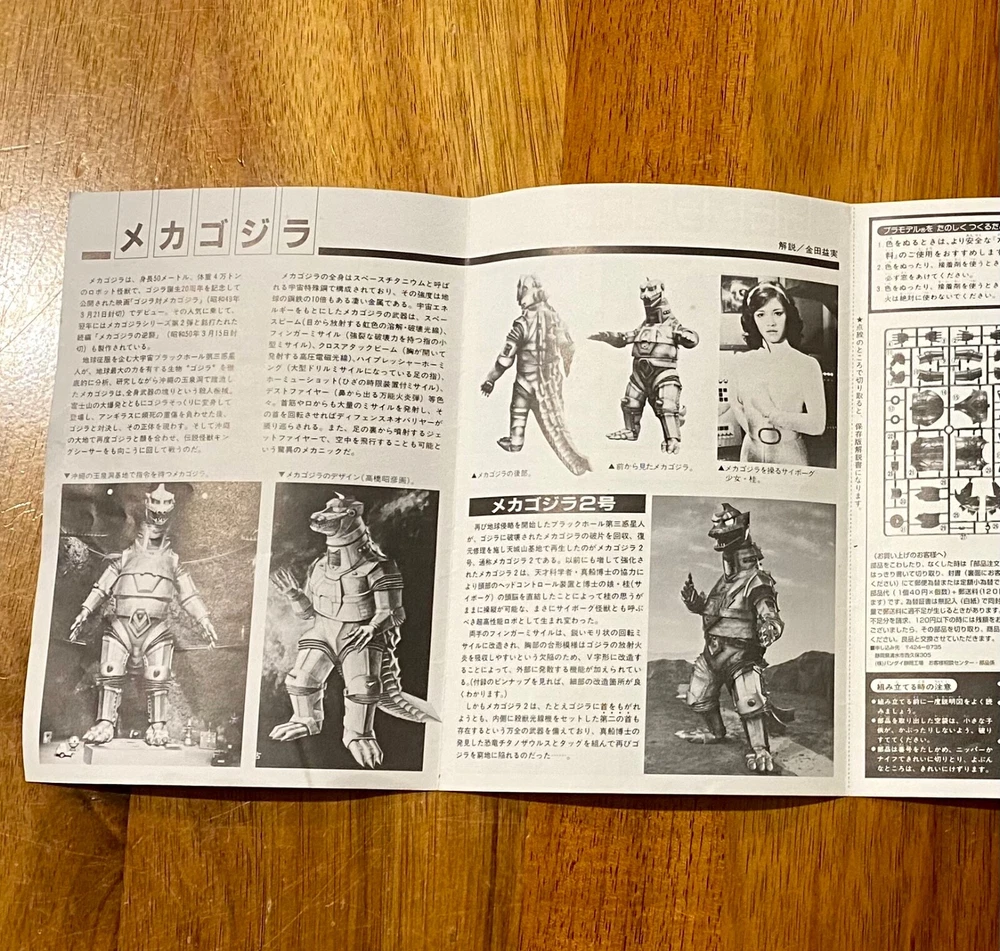 Mecha Godzilla 1974 built and painted model kit. It comes with a miniature female figure unbuilt. Included is the box art, instruction illustrated booklet and a double sided poster 60cm x 42cm. Mecha Godzilla is 15cm tall and features a removable head exposing brain.