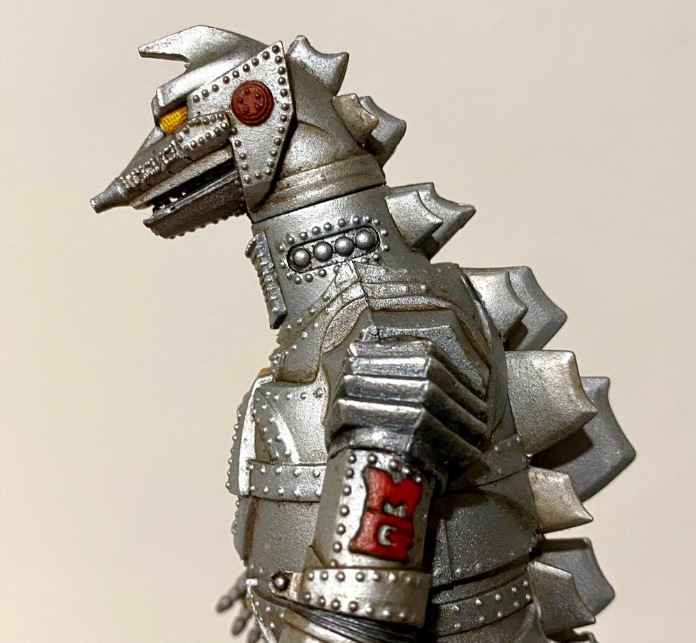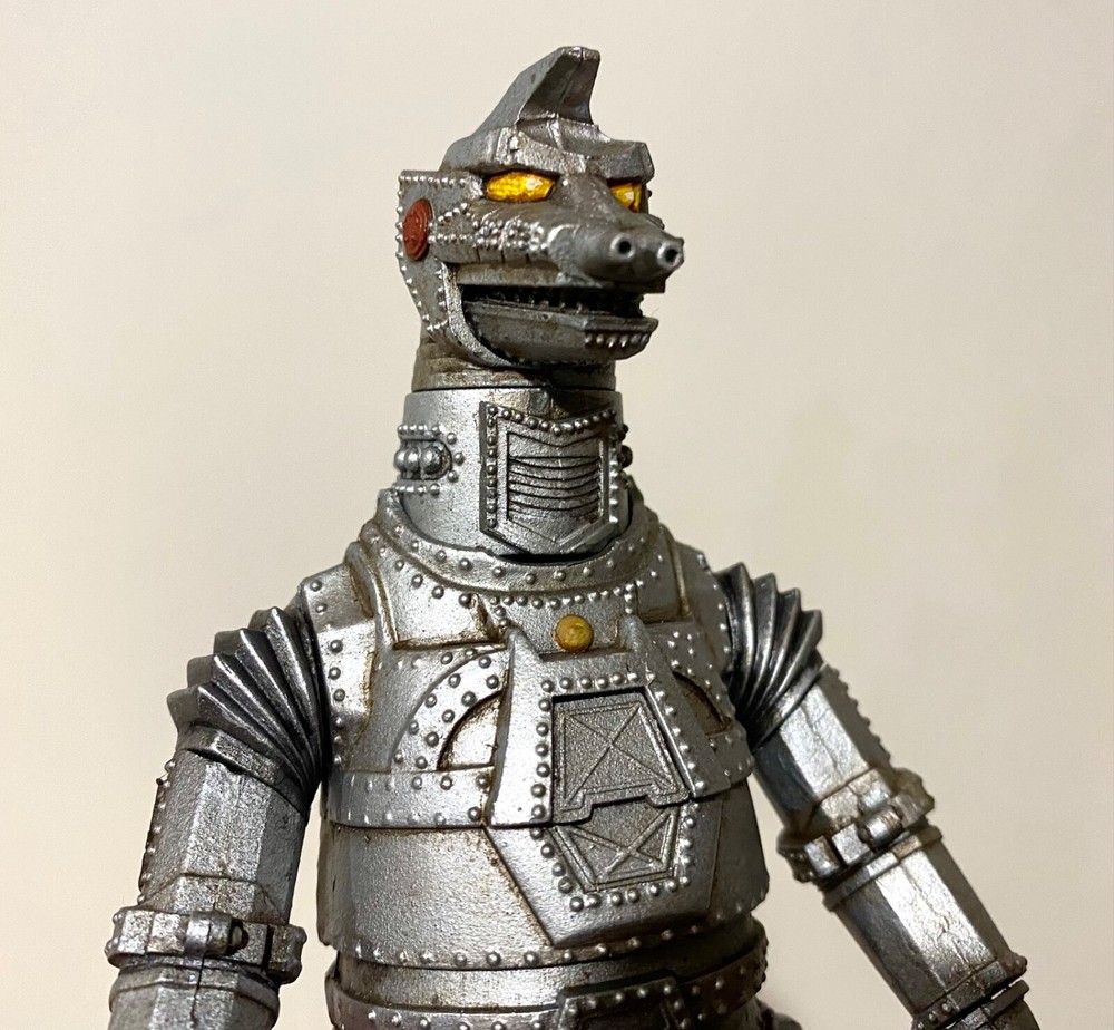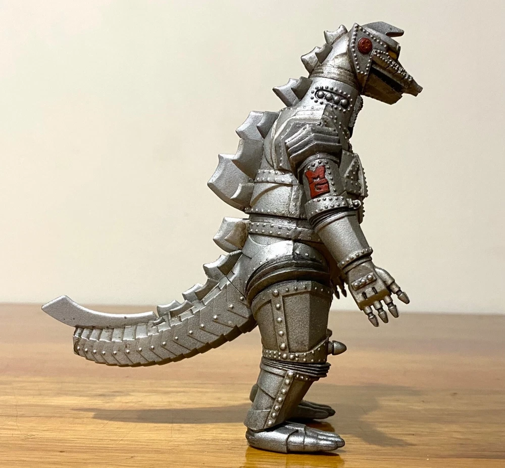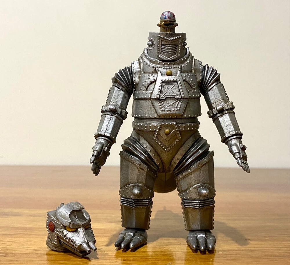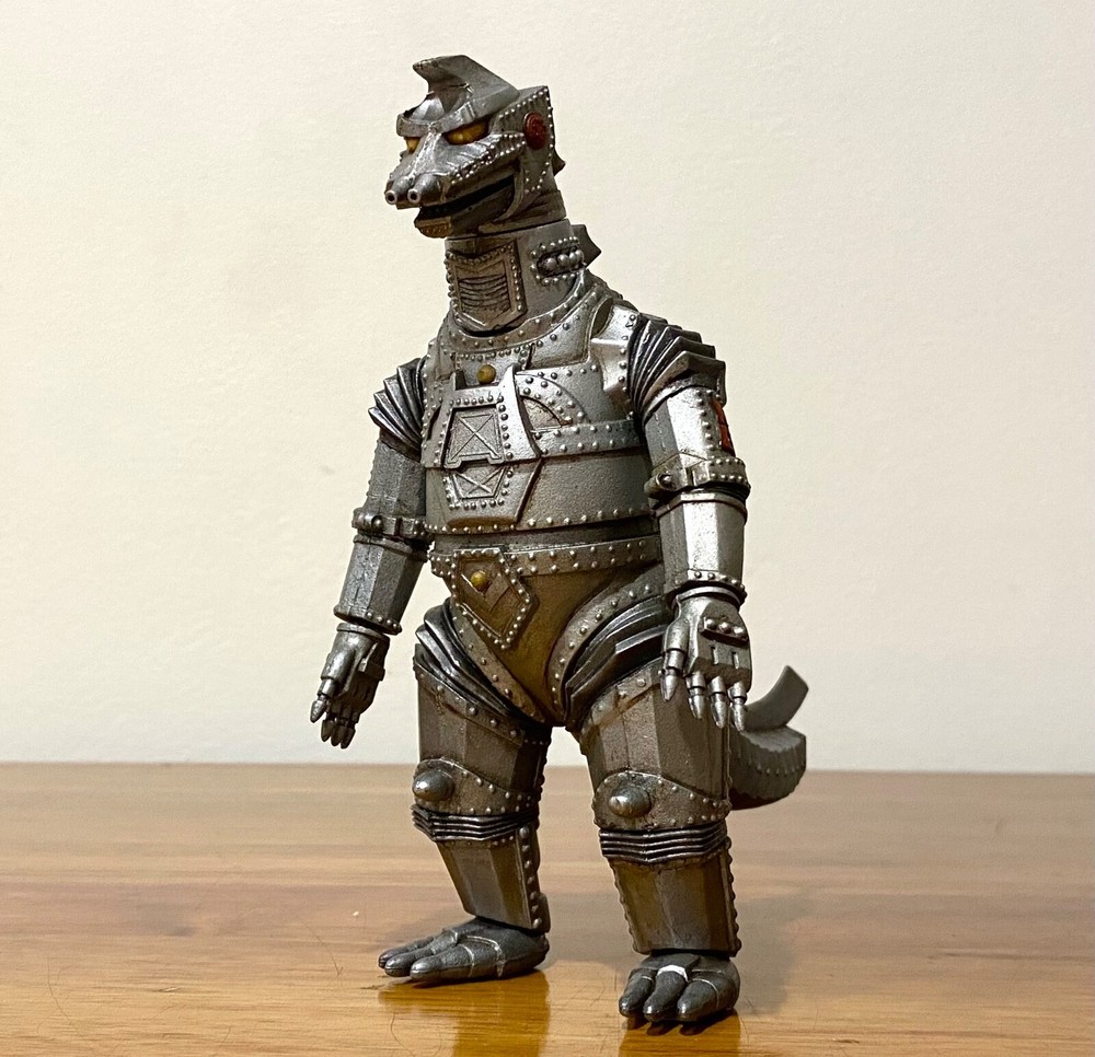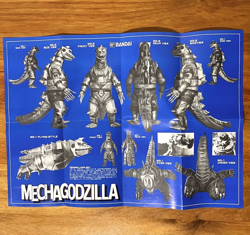 Mecha Godzilla 1974 built and painted model kit. It comes with a miniature female figure unbuilt. Included is the box art, instruction illustrated booklet and a double sided poster 60cm x 42cm. Mecha Godzilla is 15cm tall and features a removable head exposing brain.