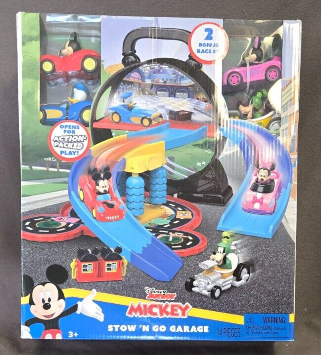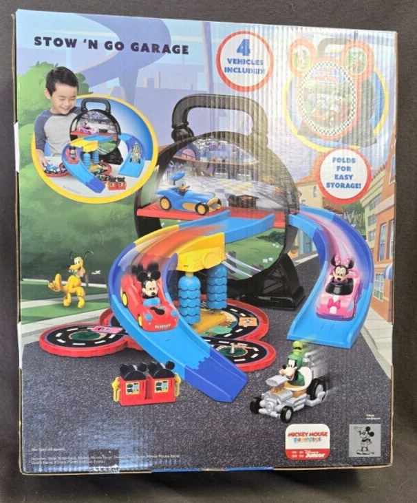 Bring home the magic of Disney with this Just Play Mickey Mouse Stow 'n Go Garage Special Edition set. The colorful multicolor cars are perfect for any young car enthusiast and come with a bonus of two additional cars. This product does not disappoint with its high-quality manufacturing and attention to detail. The brand Disney is known for its iconic characters and this set is no exception. Assembled Dimensions: L 12" x W 4"x H 14" Weight: 5 lbs. Recommended Age Range: 3+ years Included: 1 Stow ‘n Go case that opens into a playset, 4 toy vehicles (Mickey Mouse, Minnie Mouse, Goofy and Donald Duck), 8 track pieces, 1 gas pump