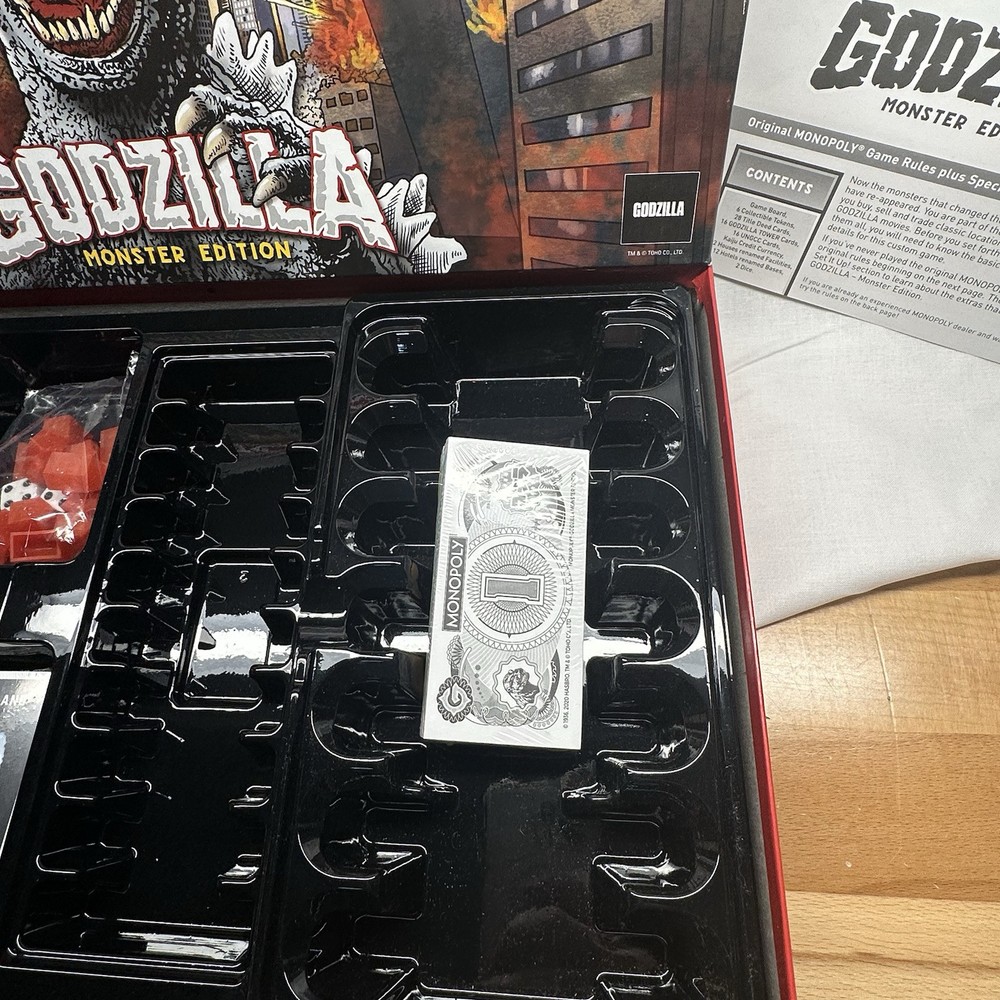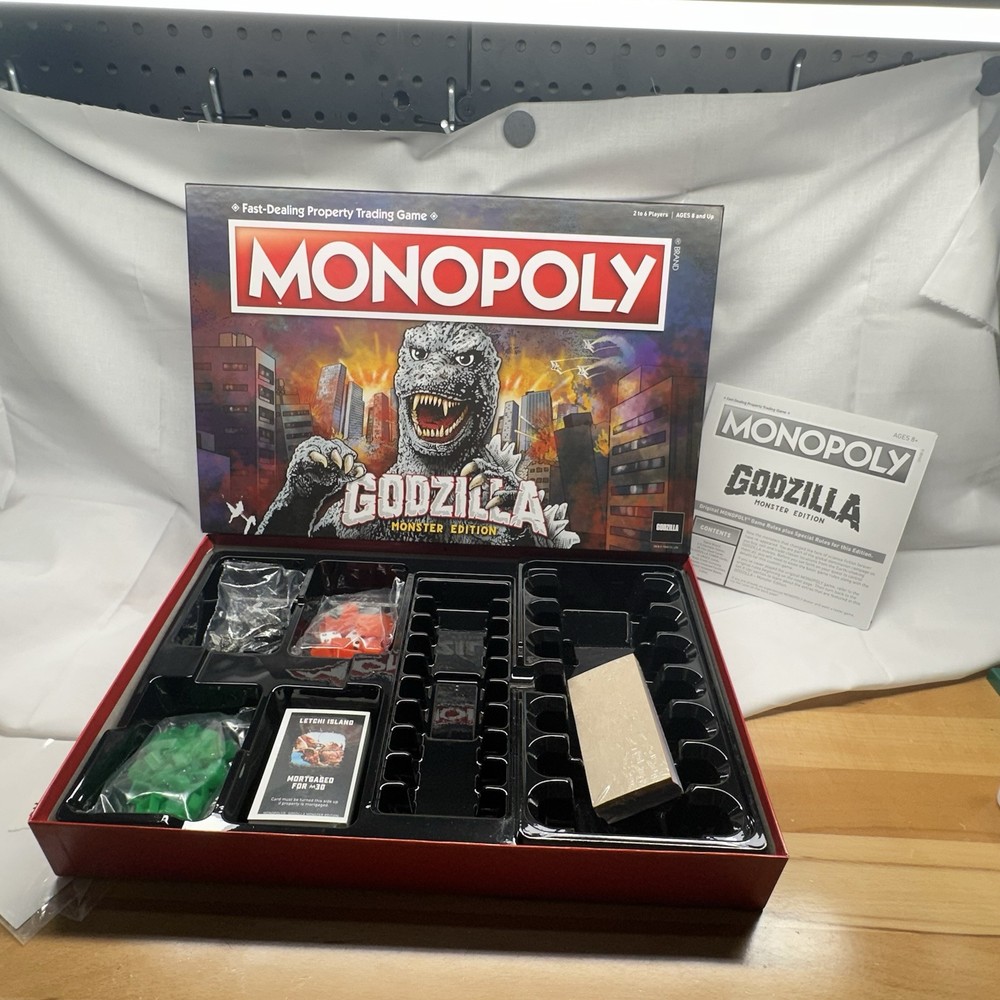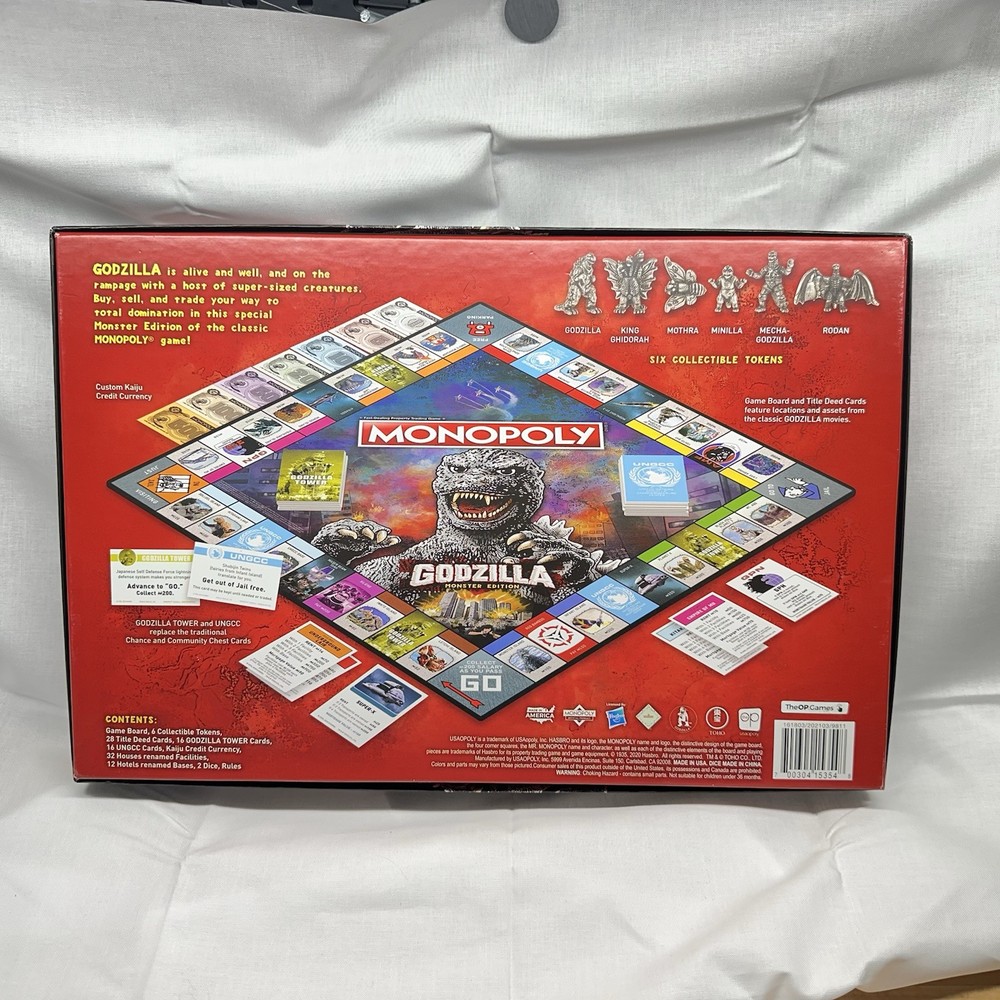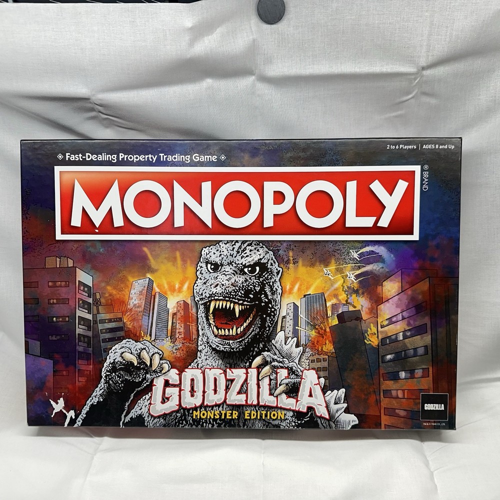 The "Monopoly - Godzilla Monster Edition" board game by USAopoly is a 2020 release featuring an officially licensed Godzilla theme. The game includes elements from the Godzilla movie and TV series, making it an exciting choice for fans of the franchise. Designed for 2 or more players, this game board is adorned with Godzilla artwork and comes with all components sealed in the original box. Recommended for ages 8 and up, this edition of Monopoly offers a unique twist on the classic game, incorporating the iconic Godzilla character into gameplay.