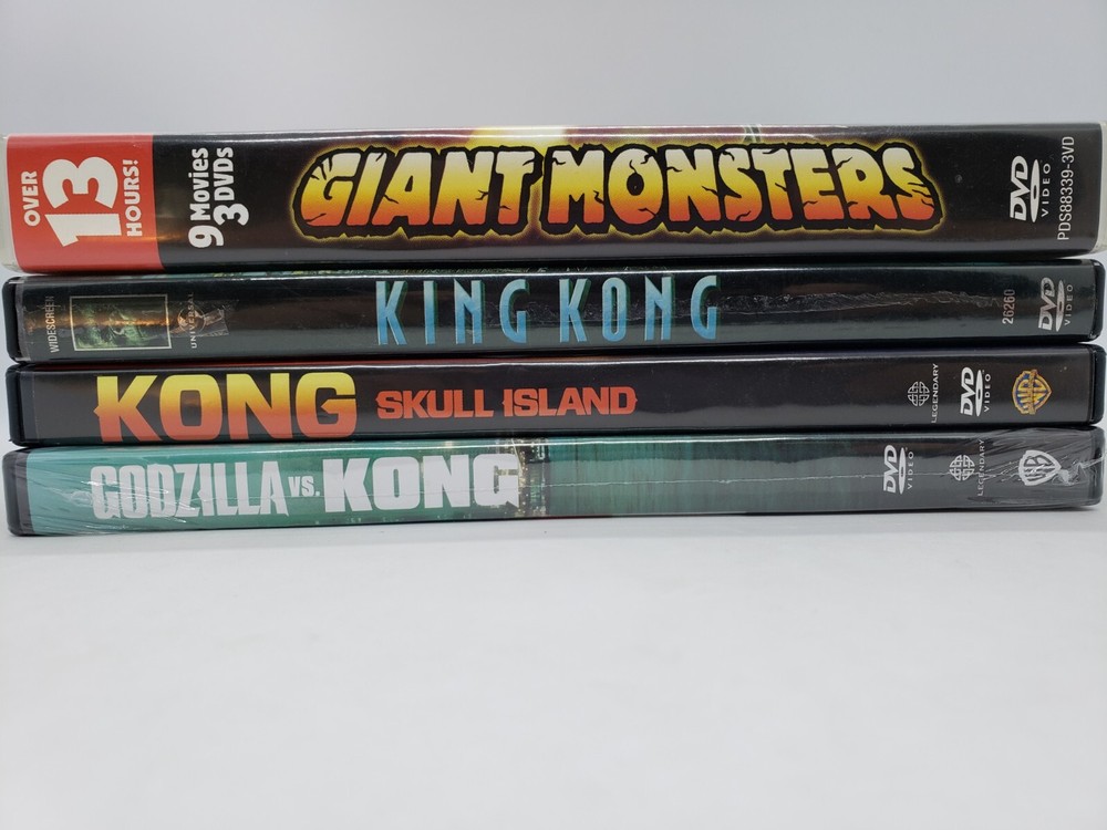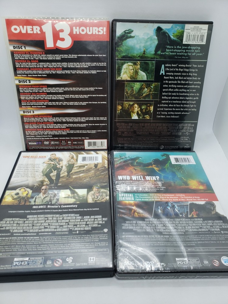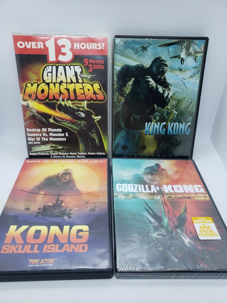 Monsters & Monkeys DVD Lot: Gamera vs. Monster X (1970), Gamera vs. Gaos (1967), Yongary Monster From The Deep (1967), Warning From Space (1956), Destroy All Planets (1968), War Of The Monsters (1966), Gamera The Invincible (1965), The Giant Gila Monster (1959), Monster From A Prehistoric Planet (1967), King Kong (2005), Kong Skull Island (2017), Godzilla vs. Kong (2021) Brand New Factory Sealed. Very Good Condition: cases have minimal wear [see photos]. Discs will be cleaned and buffed before shipping, if needed. Shipped with USPS Media Mail.