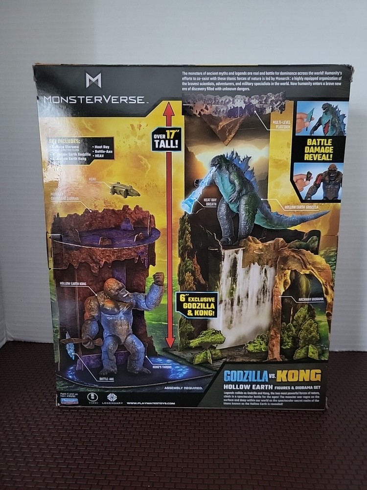 The Monsterverse Godzilla vs Kong Hollow Earth 6" Figures and Diorama Set features City Battle versions of Kong and Godzilla from the movie "Godzilla Vs Kong." The set includes a 6" City Battle Kong figure, a 6" City Battle Godzilla figure, a 3 piece diorama, a Battle Axe, Heat Ray, and Fighter Jet accessories. The figures are made of plastic and come in a multicolor design with exclusive Battle Damage Reveal features. This 2022 release by Playmates Toys is part of the Monsterverse series and is a must-have for fans of the epic monster battle.