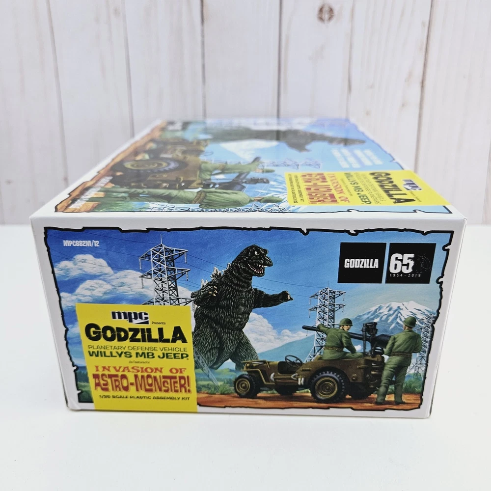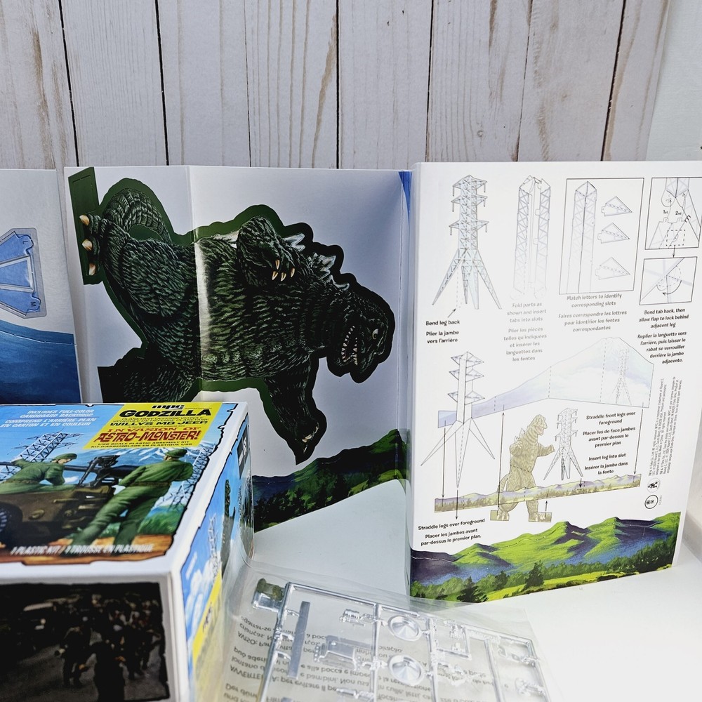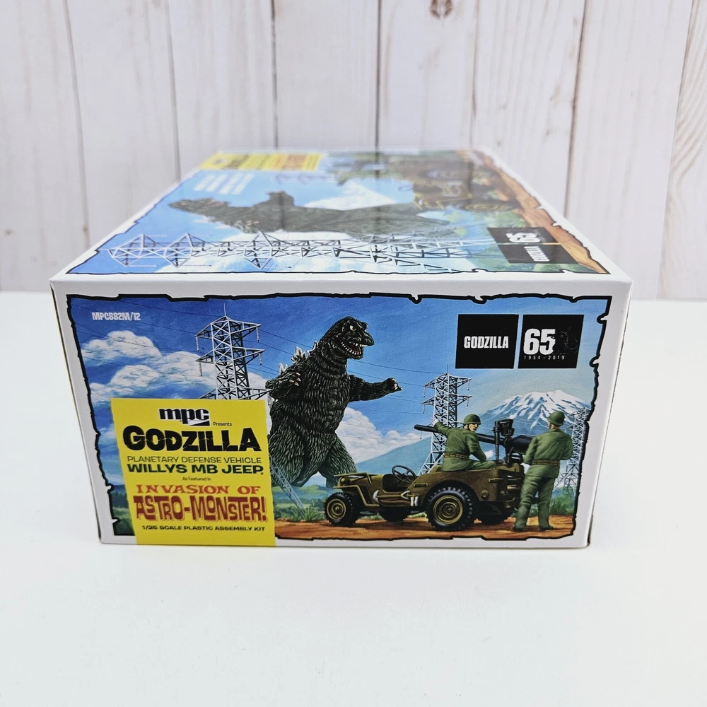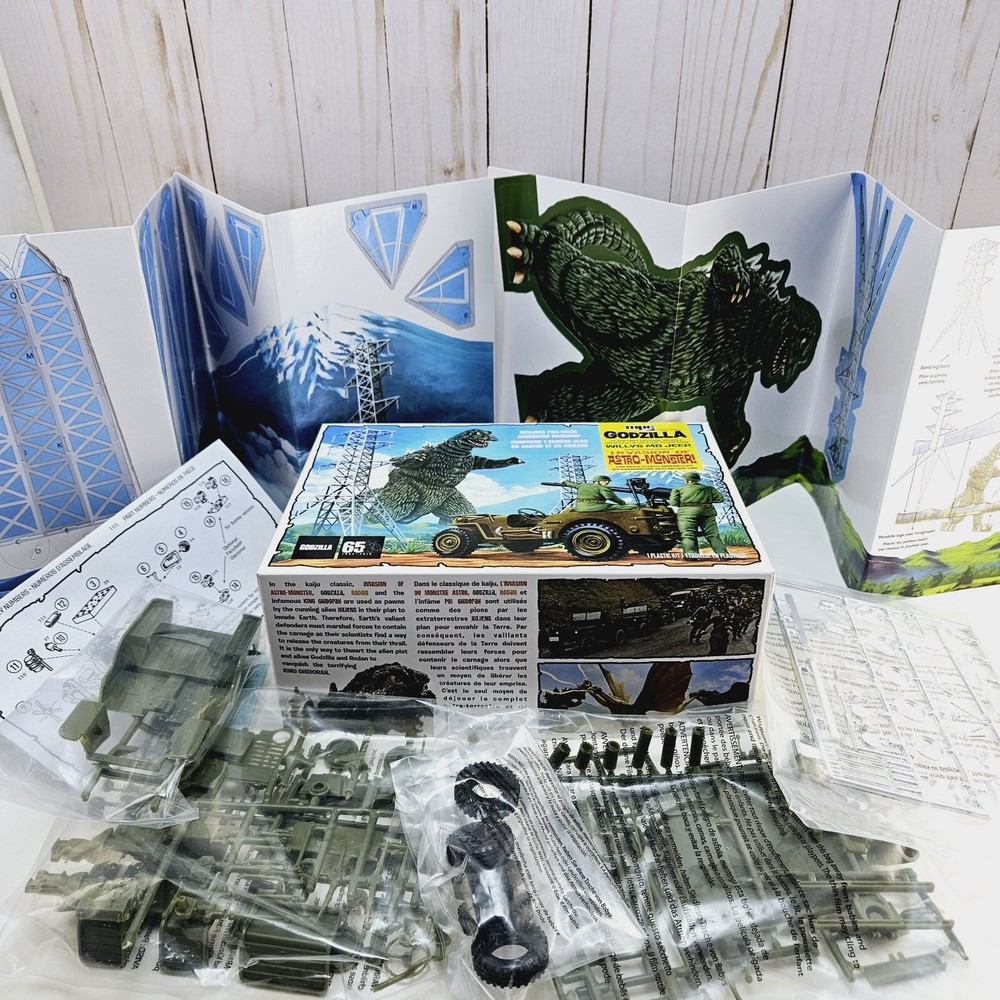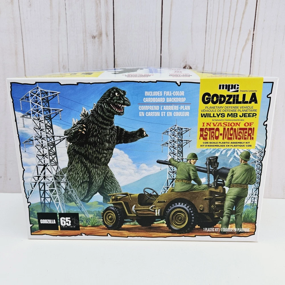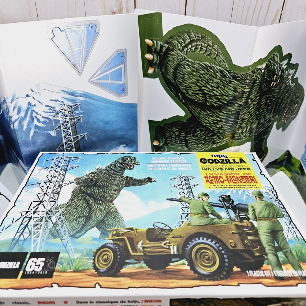 New open box complete model kit that includes a cardboard cutout backdrop with the planetary defense vehicle willys mb jeep plastic unassembled model....