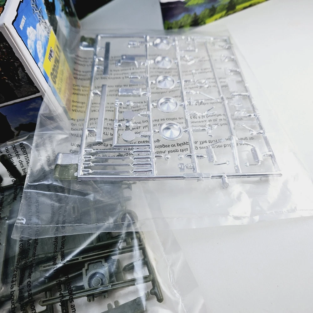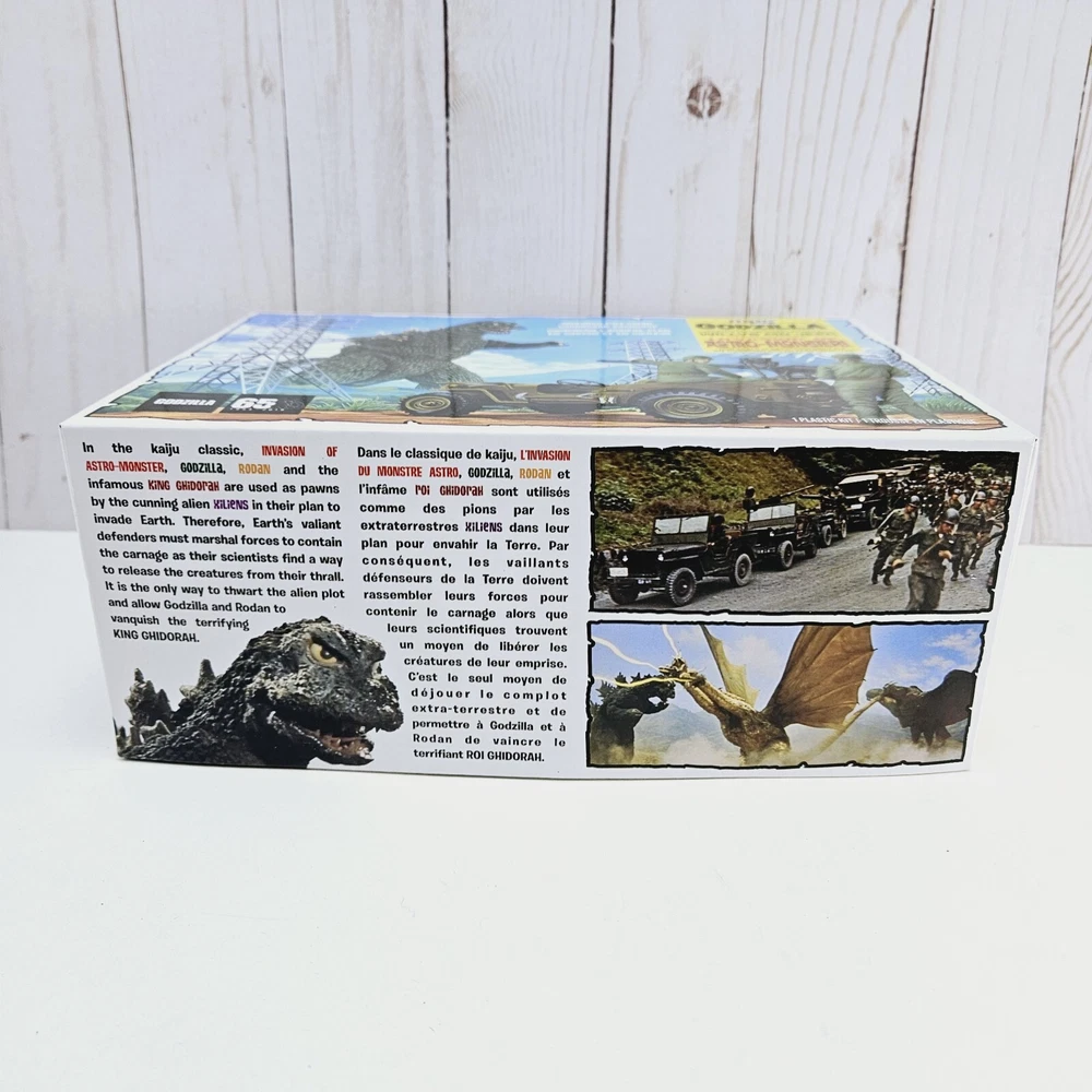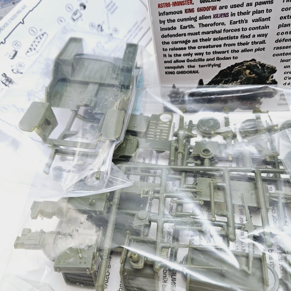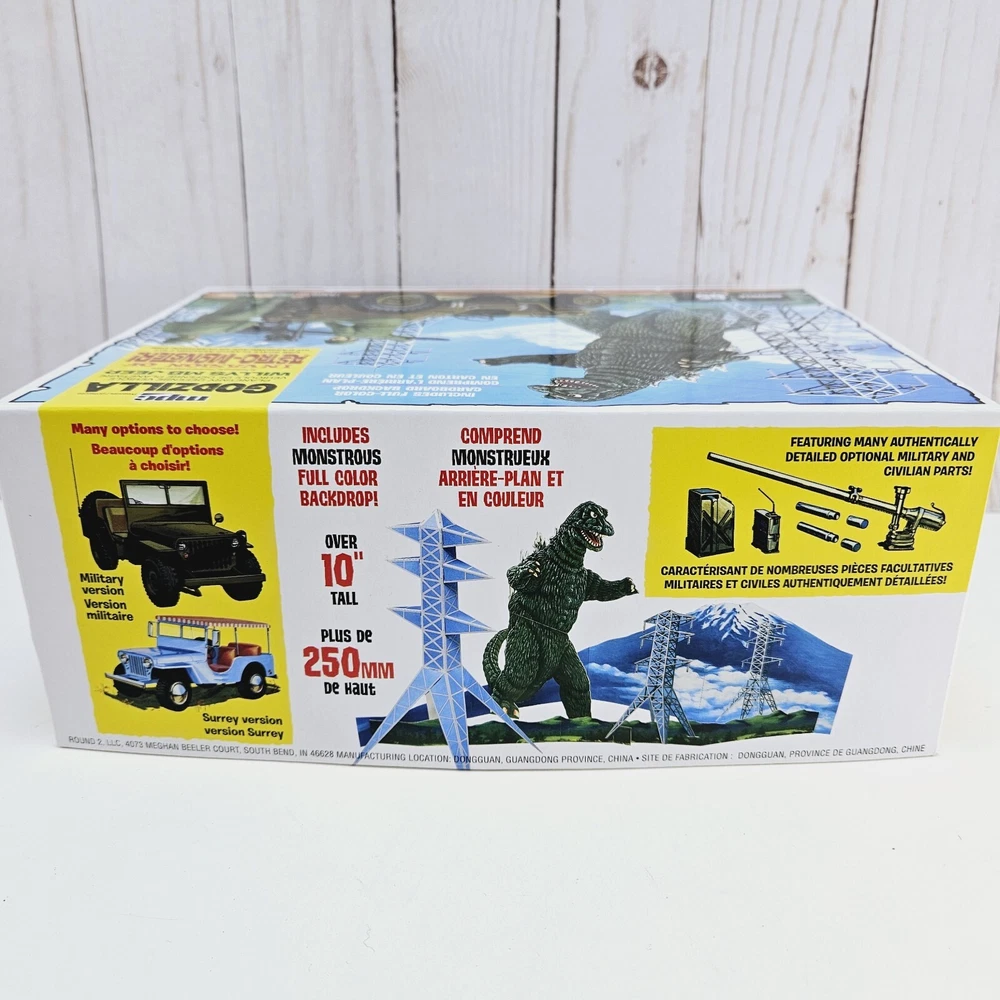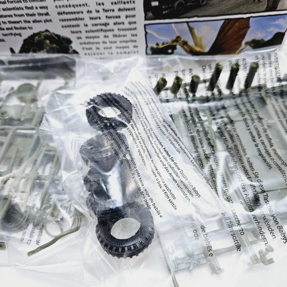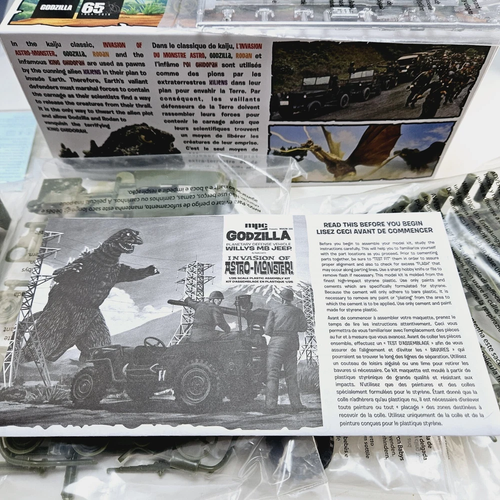 New open box complete model kit that includes a cardboard cutout backdrop with the planetary defense vehicle willys mb jeep plastic unassembled model....
