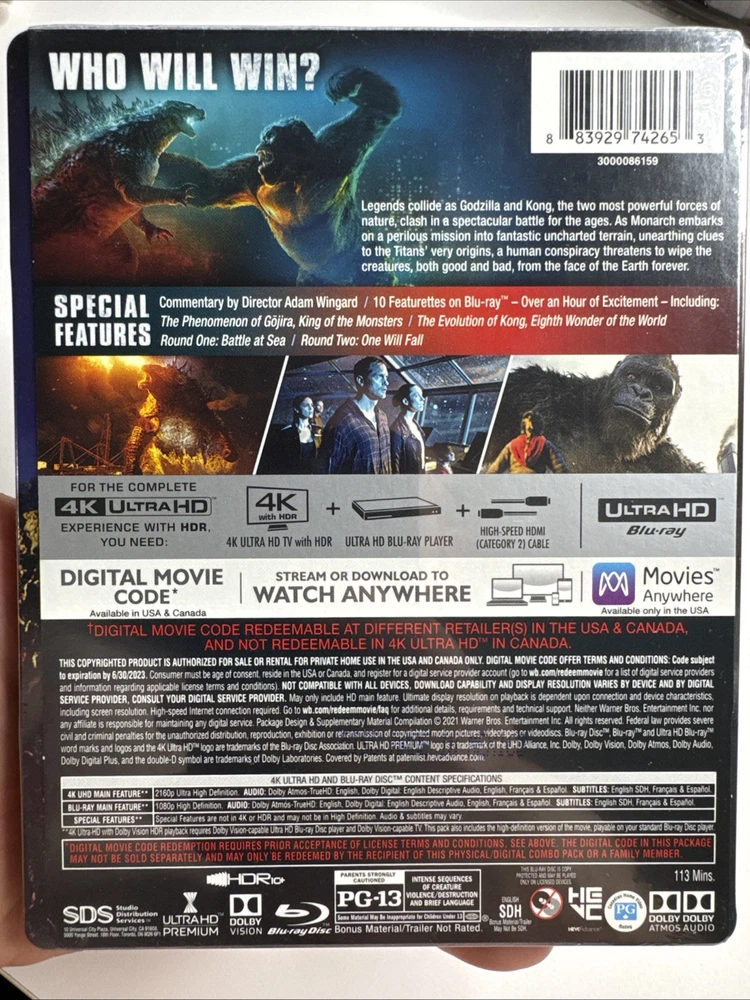 The product is a best buy exclusive steelbook edition of the movie "Godzilla vs. Kong" released in 2021. This 4k uhd blu-ray includes bonus features such as commentary and behind the scenes featurette. Directed by David Hamilton and featuring actors like Kyle Chandler, this action-packed film falls under the genres of adventure, sci-fi, and fantasy. The steelbook case adds to the collectible value of this limited edition release from Warner Bros studio.