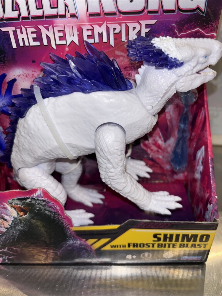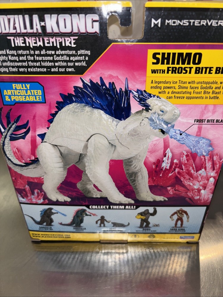 The "New 2024 Playmates Godzilla x Kong The New Empire Shimo with Frost Bite Blast" is an action figure based on the character Shimo from the "Godzilla x Kong The New Empire" movie. Made of plastic, this fully articulated figure includes a removable tail and a blue frost bite blast accessory. The design features white coloration, purple crystalline spines, and new 2024 movie theme packaging, capturing the essence of the Monsterverse Godzilla x Kong series. This collectible item is ideal for fans aged 4 and up, offering a detailed representation of Shimo with unique features like the Frost Bite Blast.