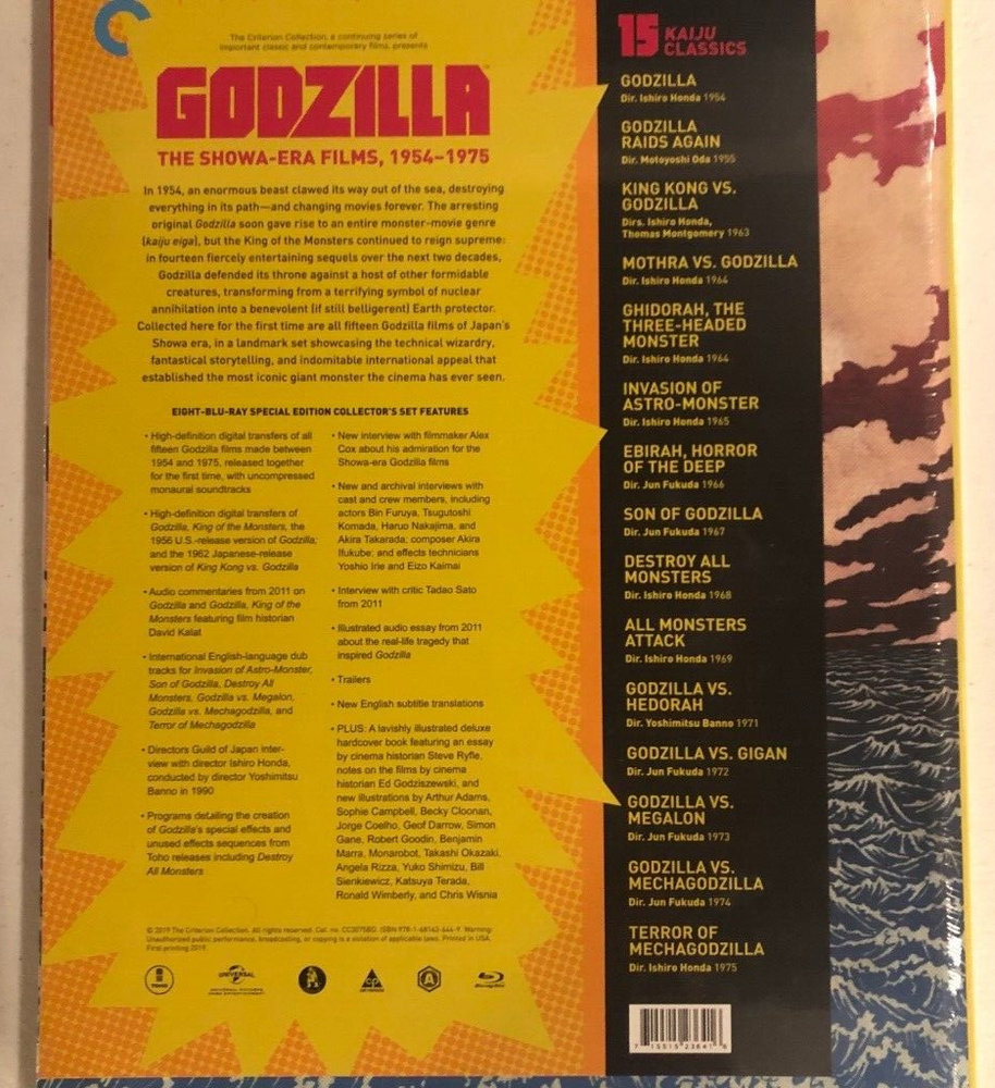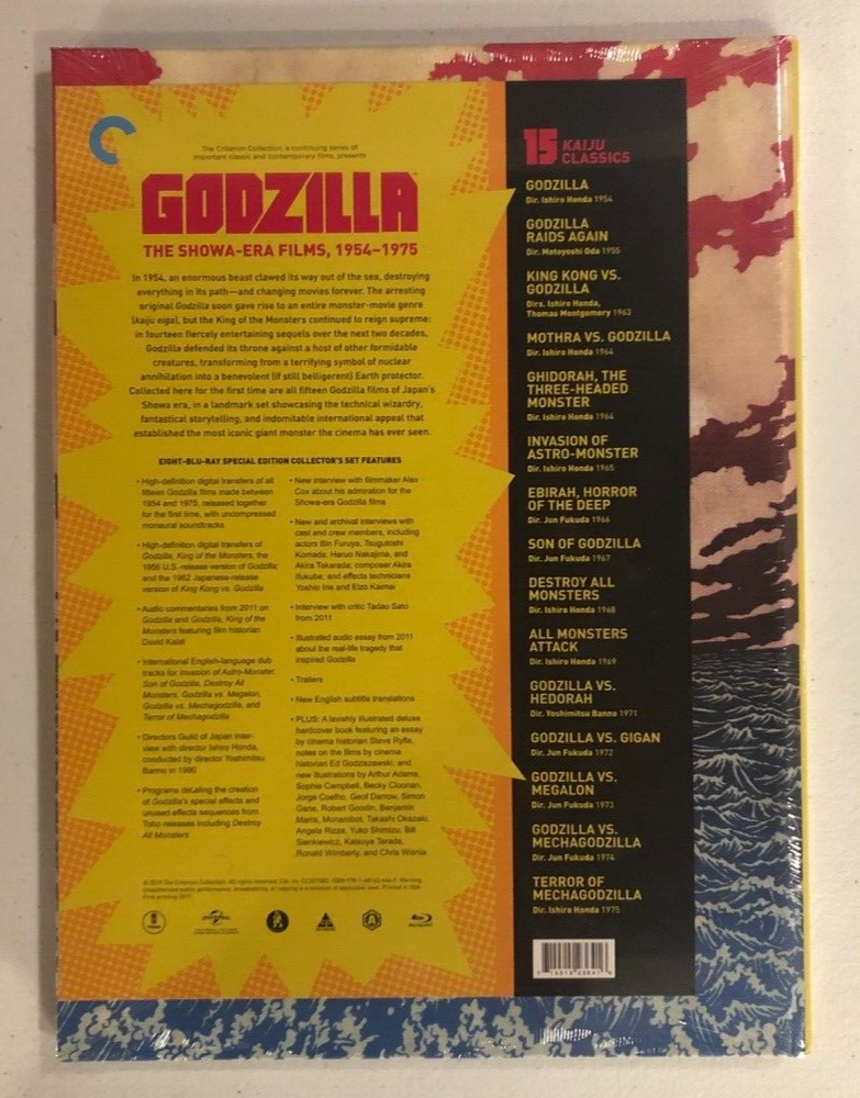 Brand New Godzilla: The Showa-Era Films, 1954–1975 Criterion Collection Blu-Ray Sealed Perfect Condition - Item is brand new, still sealed in original shrink wrap. Brand New / Perfect Condition Purchased from Criterion Collection (US) website - Fall 2022 Description - GODZILLA: THE SHOWA-ERA FILMS, 1954–1975 15 Kaiju classics now on Blu-ray IN 1954, AN ENORMOUS BEAST CLAWED ITS WAY OUT OF THE SEA, destroying everything in its path—and changing movies forever. The arresting original Godzilla soon gave rise to an entire monstermovie genre (kaiju eiga), but the King of the Monsters continued to reign supreme: in fourteen fiercely entertaining sequels over the next two decades, Godzilla defended its throne against a host of other formidable creatures, transforming from a terrifying symbol of nuclear annihilation into a benevolent (if still belligerent) Earth protector. Collected here for the first time are all fifteen Godzilla films of Japan’s Showa era, in a landmark set showcasing the technical wizardry, fantastical storytelling, and indomitable international appeal that established the most iconic giant monster the cinema has ever seen. Deluxe Packaging A lavishly illustrated deluxe hardcover book featuring an essay by cinema historian Steve Ryfle, notes on the films by cinema historian Ed Godziszewski, and new illustrations by Arthur Adams, Sophie Campbell, Becky Cloonan, Jorge Coelho, Geof Darrow, Simon Gane, Robert Goodin, Benjamin Marra, Monarobot, Takashi Okazaki, Angela Rizza, Yuko Shimizu, Bill Sienkiewicz, Katsuya Terada, Ronald Wimberly, and Chris Wisnia. A closer look at 4 influential films in the collection... Toho Studios followed the enormous success of the original Godzilla with this sequel, efficiently directed by Motoyoshi Oda as a straight-ahead monsters-on-the-loose drama. An underrated standout among the Showa Godzilla films, Godzilla Raids Again introduces the monster-versus-monster format that would dominate the remainder of the series, pitting Godzilla against the ferocious, spiny Anguirus as the kaiju wreak havoc in the streets of Osaka in a series of elaborate set pieces that succeed in upping the ante for destruction. FILM INFO Spine #1000 Godzilla 1954 Godzilla (a.k.a. Gojira ) is the roaring granddaddy of all monster movies. It’s also a remarkably humane and melancholy drama, made in Japan at a time when the country was reeling from nuclear attack and H-bomb testing in the Pacific. Its rampaging radioactive beast, the poignant embodiment of an entire population’s fears, became a beloved international icon of destruction, spawning more than thirty sequels. A thrilling, tactile spectacle that continues to be a cult phenomenon, the original 1954 Japanese version is presented here, along with Godzilla, King of the Monsters, the 1956 “Americanized” version. Godzilla Raids Again 1955 Toho Studios followed the enormous success of the original Godzilla with this sequel, efficiently directed by Motoyoshi Oda as a straight-ahead monsters-on-the-loose drama. An underrated standout among the Showa Godzilla films, Godzilla Raids Again introduces the monster-versus-monster format that would dominate the remainder of the series, pitting Godzilla against the ferocious, spiny Anguirus as the kaiju wreak havoc in the streets of Osaka in a series of elaborate set pieces that succeed in upping the ante for destruction. New cover illustration by Katsuya Terada King Kong vs. Godzilla 1963 After his first two cinematic rampages, Godzilla was revived as an adversary for the Hollywood import King Kong. When Kong is discovered on a remote island by a publicity-hungry pharmaceutical company, the giant ape is set on a collision course with Godzilla, and Japan braces for a double dose of devastation. Both the Japanese-release version and the U.S.-release cut were rousing hits, cementing Godzilla’s status as a series-worthy star. New cover illustration by Arthur Adams Mothra vs. Godzilla 1964 Godzilla faces off against the benevolent insect monster-god Mothra in this clash of the titans, a crossover battle between two of Toho Studios’ most popular monsters—the last in which Godzilla would figure as a malevolent villain rather than a fearsome hero. Mothra vs. Godzilla marks a creative high point in the Godzilla series, with pointed social commentary from director Ishiro Honda, a masterful score by Akira Ifukube, and astonishing special-effects work by Eiji Tsuburaya. New cover illustration by Angela Rizza Ghidorah, the Three-Headed Monster 1964 After laying waste to an alien civilization on Venus, the three-headed, lightning-emitting space monster Ghidorah brings its insatiable thirst for destruction to Earth, where fierce foes Godzilla, Rodan, and Mothra must join forces in order to deal with the unprecedented threat. An electrifying screen debut for Godzilla’s archenemy Ghidorah, this film also marks a turning point for the series, as the first time the King of the Monsters acts to protect the planet. New cover illustration by Monarobot Invasion of Astro-Monster 1965 Aliens from Planet X make an irresistible offer to the people of Earth: let them borrow Godzilla and Rodan to help defeat King Ghidorah, and in return they will provide a cure for all known human disease. But the aliens’ duplicity is soon revealed, as they deploy all three monsters in their quest to conquer Earth. This retro romp, featuring American star Nick Adams, stands as a high point in the Showa Godzilla series. New cover illustration by Benjamin Marra Ebirah, Horror of the Deep 1966 The first Godzilla film directed by Jun Fukuda, who would go on to direct four more, is fast-paced and light in tone, and builds to a riveting race-against-time finale. On a secluded island in the South Seas, a group of castaways stumble upon a paramilitary organization whose nefarious nuclear activities threaten the world at large—and set the stage for kaiju clashes involving Godzilla, Mothra, and the giant crusta