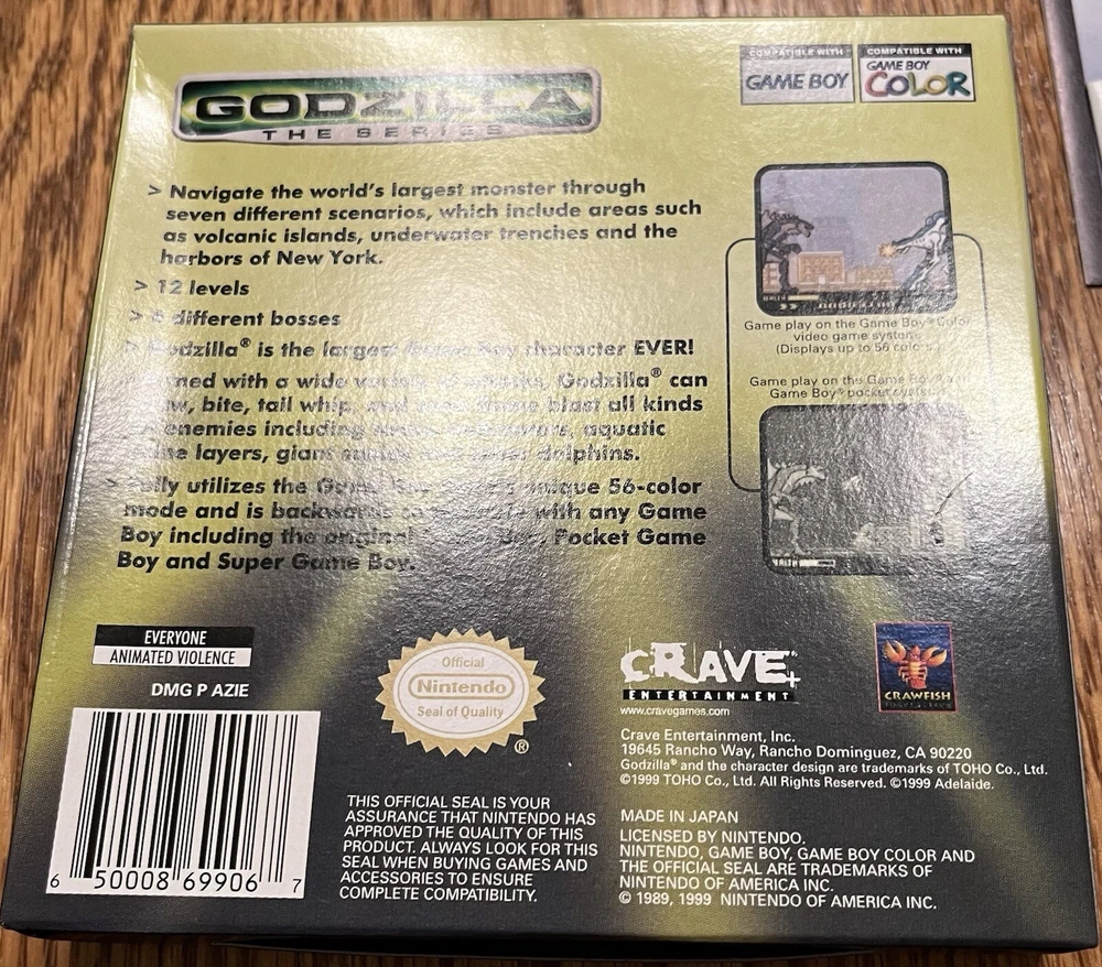 Nintendo Game Boy Color Godzilla The Series With Box & Manual Tested Works. Tested and working. Manual has a little light wear on the front cover as pictured. Cartridge is in nice shape. Box has some minor wear, most notably being a bit concave on the back. See pics for details.