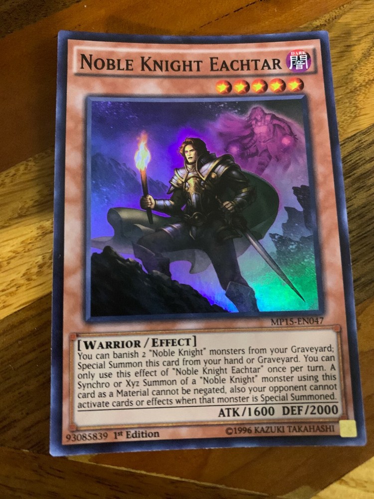 Hello! You are buying one Noble Knight Eachtar MP15-EN047 1st Edition Super Rare in near-mint condition. As a thank you for buying from me, I will throw in two free Yugioh commons! Thank you so much for looking, have a great day! If there is ever an issue, please let me know so I can do whatever I can to resolve it! Please check out my other items! I have many more single cards!