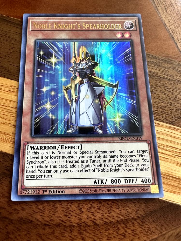Hello! You are buying one Noble Knight's Spearholder BROL-EN019 1st Edition Ultra Rare in near-mint condition. As a thank you for buying from me, I will throw in two free Yugioh commons! Thank you so much for looking, have a great day! If there is ever an issue, please let me know so I can do whatever I can to resolve it! Please check out my other items! I have many more single cards!