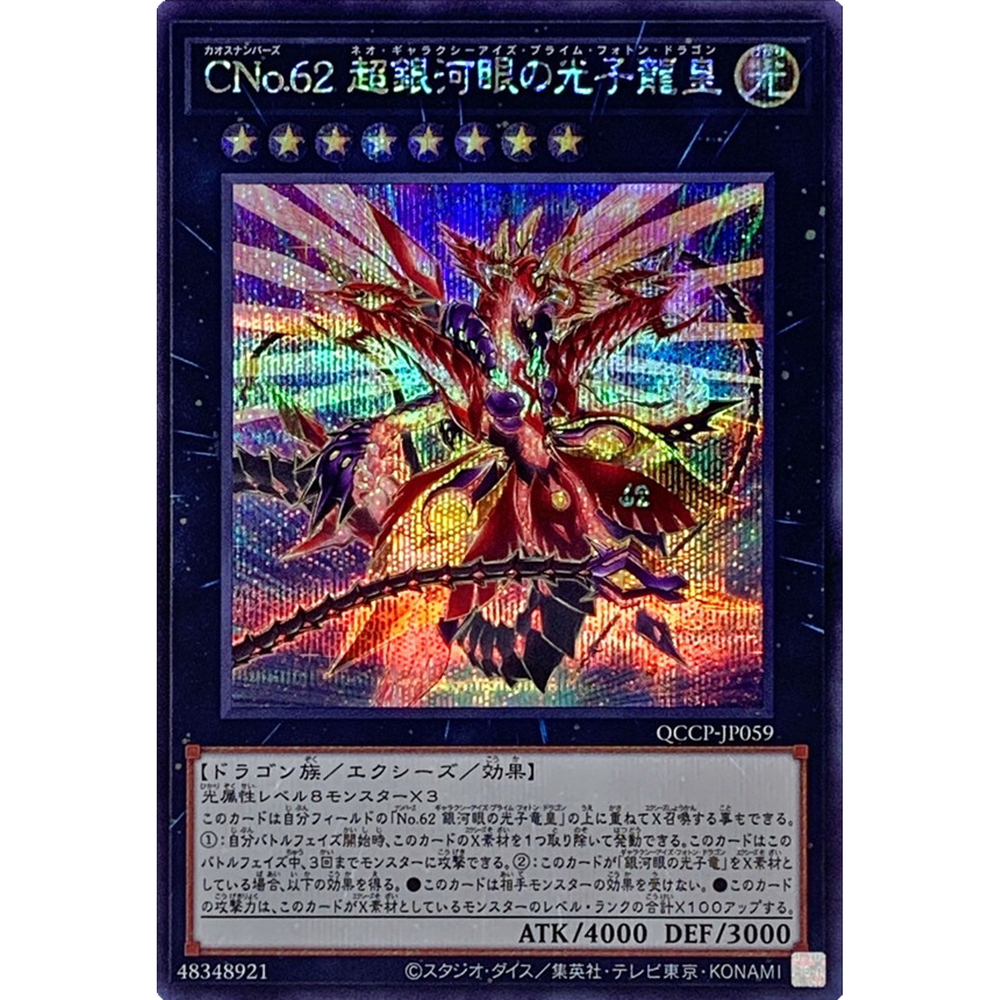 Description Number C62: Neo Galaxy-Eyes Prime Photon Dragon Secret QCCP-JP059 side:Pride Condition : Near Mint Condition - As a Trading Cards collector myself, I can check the condition exactly. 【NM】Near Mint (4/4): Display minimal or no wear or damage. All surfaces and edges are pristine and appear “fresh out of the pack. 【EX】Excellent (3/4): Have slight corner and edge wear along with minor scratches on the surface, but no other flaws. 【VG】Very good (2/4): Have discernible flaws such as border and corner wear, noticeable scratches and creases, slight bends, notching, layering, and moderate discoloration or whitening. 【PR】Poor (1/4): Show a massive amount of wear and damage. Corners and edges will be rounded, chipped, or fuzzy, and there will be major discoloration, layering, notching, creasing, and scratches. - I follow “eBay card conditions and guidelines”. - Click here for details : https://pages.ebay.com/cardconditions/ Shipping Economy Shipping Japan Post Air Mail : takes about 1~2 weeks, +Handing time No tracking. Standard Shipping Japan Post Air Mail : takes about 1~2 weeks, +Handing time With tracking. Expedited Shipping FedEx or EMS : takes about 1~4 days, +Handing time With tracking. - Use a loader, waterproof pack, and put it in a cushioned envelope. - You can save shipping fees when you buy multiple items. No charge shipping fees for additional items. International Buyers - Please Note: Import duties, taxes and charges are not included in the item price or shipping charges. These charges are the buyer's responsibility. Please check with your country's customs office to determine what these additional costs will be prior to bidding/buying. These charges are normally collected by the delivering freight(shipping) company or when you pick the item up -do not confuse them for additional shipping charges. We do not mark merchandise values below value or mark item as "gift" -US and international government regulations prohibit such behavior.