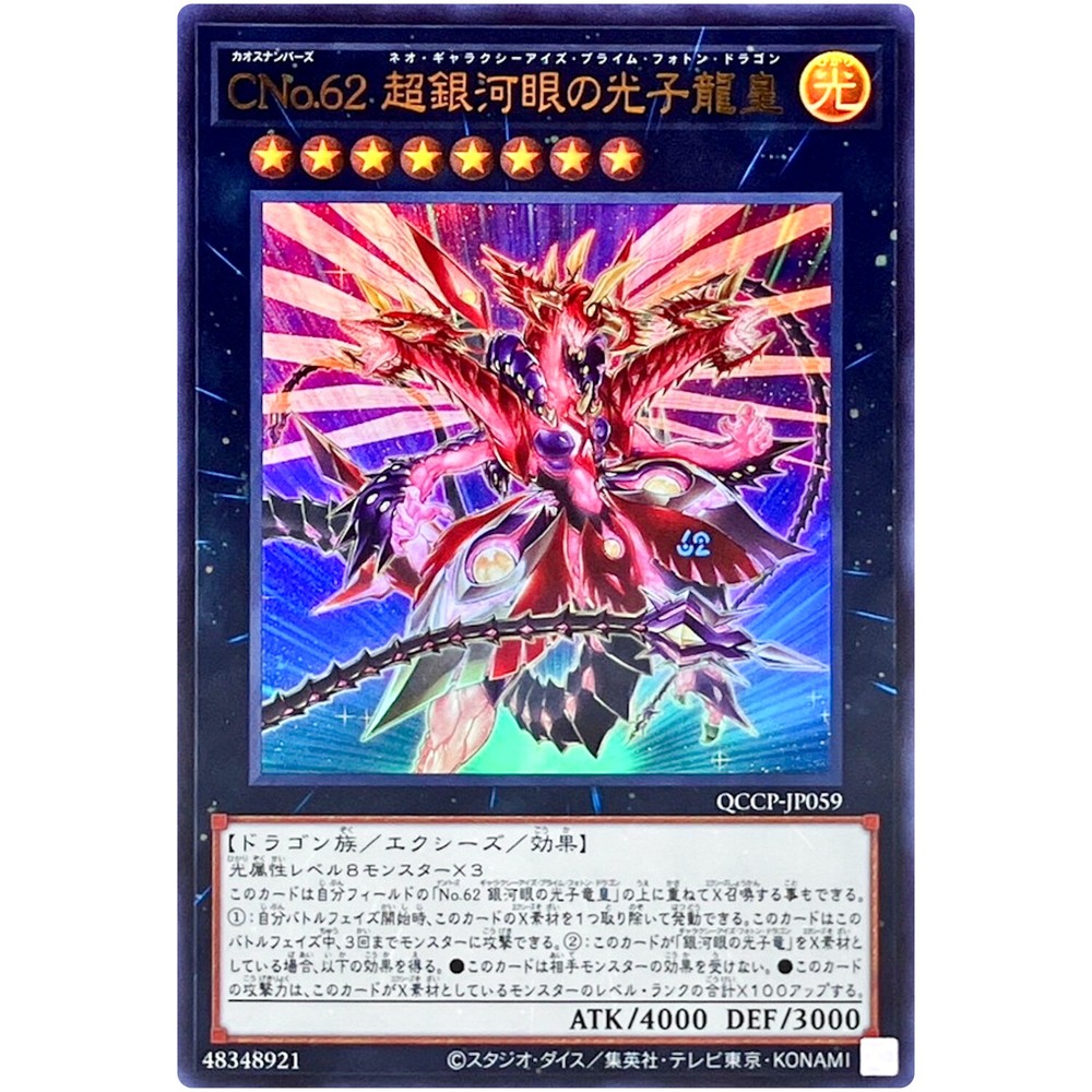 Item Description QCCP-JP059 Number C62: Neo Galaxy-Eyes Prime Photon Dragon Front Back Card Name : Number C62: Neo Galaxy-Eyes Prime Photon Dragon Character : Number C62: Neo Galaxy-Eyes Prime Photon Dragon Rarity : Ultra Rare Card Number : QCCP-JP059 Set : Quarter Century Chronicle side:Pride Type : Effect Xyz Monster Language : Japanese Card Condition : Near Mint Purchased cards will be clipped with cardboard, waterproofed, and shipped without any scratches or folds. Cards over $20 will be packed even tighter with a loader for each card. Shipping Policy Free shipping worldwide. Free shipping does not include tracking. There is an additional cost of US $4 for tracking. If you purchase cards totaling US $30 or more, you will receive a free tracking number. All of the products will be shipped from Japan. Economy Shipping Air mail ( no tracking ) Free Shipping Delivery time : About 2-4 weeks Standard Shipping Air mail ( with tracking ) US $4 Delivery time : About 2-4 weeks Expedited Shipping FedEx or EMS or DHL ( with tracking ) US $24 Delivery time : About 1-2 weeks Payment Policy We accept all major credit cards and Paypal payments. Return Policy We hope you will love your purchase, houever if you need to return it, we have a 30 day return policy. International Buyers Import duties, taxes, and charges are not included in the item price or shipping cost. These charges are the buyerʼs responsibility. Please check with your countryʼs customs office to determine what these additional costs will be prior to bidding or buying. If the cancellation is due to the buyer, wewill charge a fee. If there is a remote charge for your address, we will charge you for additional shipping. We are honored to receive the eBay Japan Awards 2022! I am thrilled to share that my store has won the eBay Japan Awards 2022 ! This amazing accomplishment wouldnʼt have been possible without our wonderful customers. A heartfelt thank you for your ongoing support. We will continue to improve our services, offering a diverse selection of items and top-notch customer care Thank you for helping us achieve this prestigous recognition, and we look forward to serving you in the future! Copyright ©️ 2024 Animart Japan