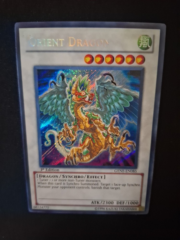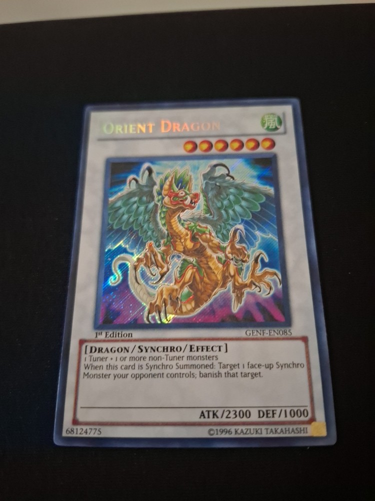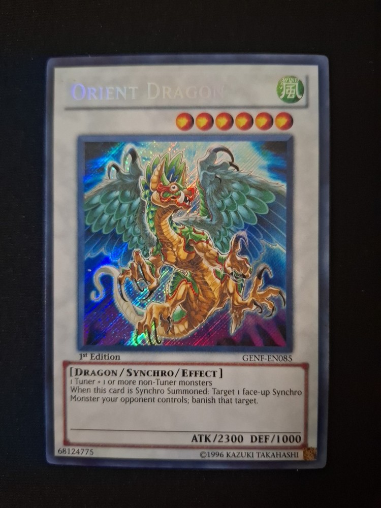 The Orient Dragon Secret Rare 1st Edition GENF-EN085 Yugioh card is a highly sought-after collectible for Yu-Gi-Oh! TCG enthusiasts. Manufactured by Konami, this English-language card features a Dark attribute, Japanese card size, and belongs to the Photon Hypernova set. With a Dragon creature type and Secret Rare rarity, this Fusion card named "Divine Arsenal AA-ZEUS - Sky Thunder" boasts a foil finish and is a valuable addition to any card collection.