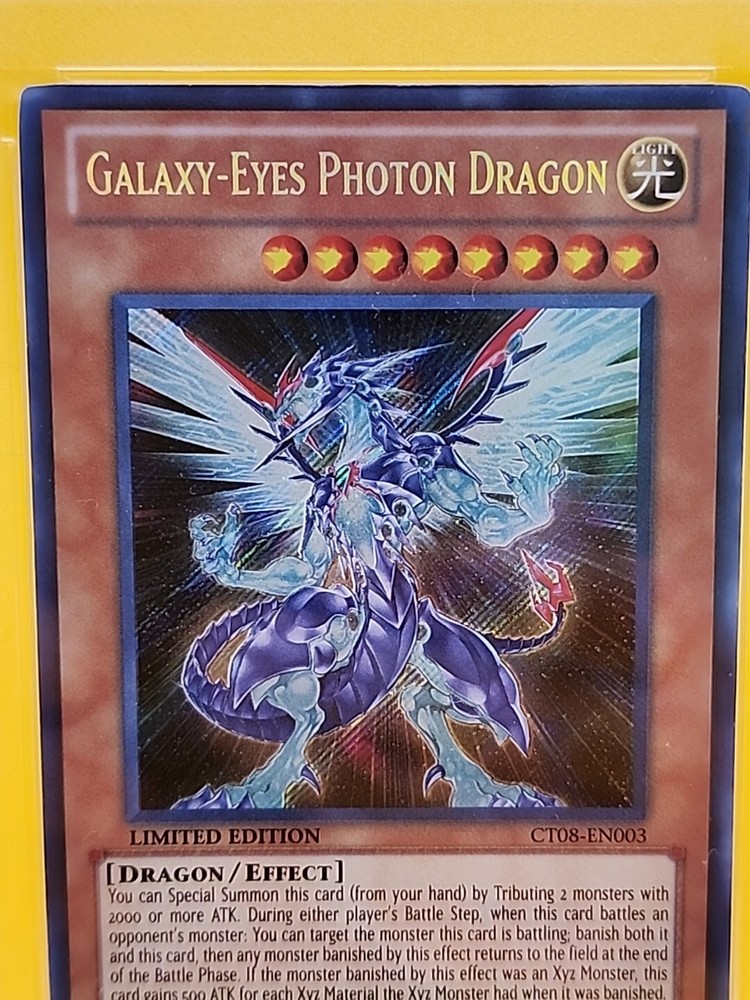 This PSA 6 Galaxy-Eyes Photon Dragon CT08-EN003 card is a must-have for any Yu-Gi-Oh! TCG collector. With its Secret Rare rarity, this card is a valuable addition to your collection. It has been certified with the number 80471364 and professionally graded with a 275010 condition type and a grade of 275028. This card features the iconic Galaxy-Eyes Photon Dragon and is part of the Collectible Tin series. It is perfect for players and collectors alike and comes with fast shipping. Don't miss out on the opportunity to add this amazing card to your collection today.
