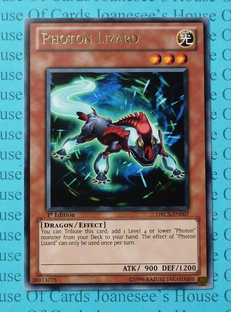This is the Silver Rare Light Dragon Photon Lizard 3 Stars ATK/9 00 DEF/1200 Card text: You can Tribute this card; add 1 Level 4 or lower "Photon" monster from your Deck to your hand. You can only use this effect of "Photon Lizard" once per turn. ORCS-EN007 1st Edition English Mint Condition Totally Original Konami (or your money back!) I will deliver in safe packaging to keep it in perfect condition. Ideal for players and collectors alike. Check out my other items! I will combine postage costs for multiple purchases. Sign up for my email newsletters by adding my eBay Shop to your favourites Paypal payment preferred - Will attempt to post within 24hrs of payment Personal cheques and postal orders from U.K. bidders are also permitted but will have to wait until they are cleared before shipping takes place. All International purchases need to be paid by Paypal only. (No Bank Transfer)