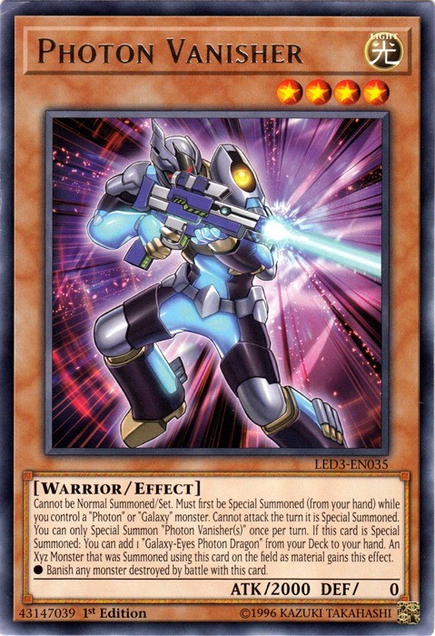 Photon Vanisher - LED3-EN035 - Rare - 1st Edition Image is a stock photo of the card. You will receive the card in Lightly Played condition Condition: Lightly Played ATK/DEF : 2000/0 Attribute : Light Card Number : LED3-EN035 Card Rules : Card Text : Cannot be Normal Summoned/Set. Must first be Special Summoned (from your hand) while you control a "Photon" or "Galaxy" monster. You can only Special Summon "Photon Vanisher" once per turn this way. If this card is Special Summoned: You can add 1 "Galaxy-Eyes Photon Dragon" from your Deck to your hand. Cannot attack the turn it is Special Summoned. An Xyz Monster that was Summoned using this card on the field as material gains this effect. ? Monsters destroyed by battle with this card are banished instead of being sent to the GY. Card Type : Effect Monster Edition : 1st Level : 4 Monster Type : Warrior Name : Photon Vanisher Passcode : 43147079 Pendulum Scale : Rarity : Rare Set : Legendary Duelists: White Dragon Abyss Be sure to visit our store for a wide selection of your favorite cards! We are running specials RIGHT NOW!! Shipping Options: ~Ships in a regular white envelope with a stamp for FREE! (THERE IS NO TRACKING INFORMATION AVAILABLE FOR THE ABOVE METHOD. SHIPPING TIME IS 4-10 BUSINESS DAYS) ~Ships in a TRACKEDbubble mailer for $5.99! ~Shipments are handled same or next business day. ~FREE SHIPPING for each additional card, so shop around our store!