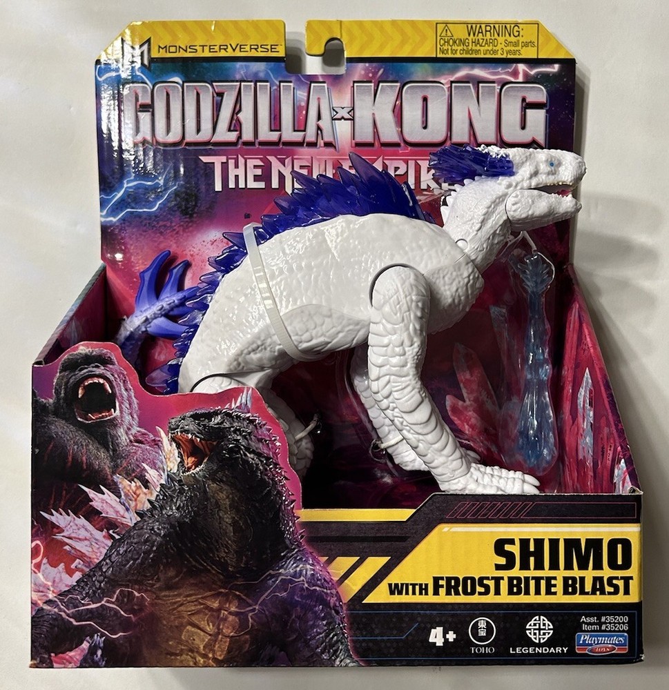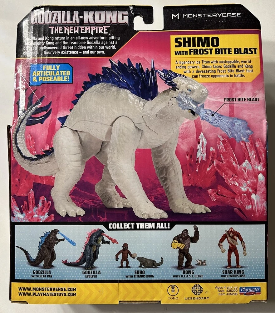 Step into the Monsterverse with the Playmates Godzilla x Kong: The New Empire 6" Shimo action figure. This fully articulated and poseable figure stands at 6 inches tall and comes with a removable tail and blue frost bite blast. The packaging is themed after the new 2024 Godzilla x Kong movie. Fans of the Monsterverse will appreciate the attention to detail on this Shimo figure, featuring purple crystalline spines and a white color scheme. Suitable for ages 4 and up, this original licensed reproduction is a must-have for any collector. Bring home the epic battles of Godzilla x Kong with this amazing action figure from Playmates Toys.