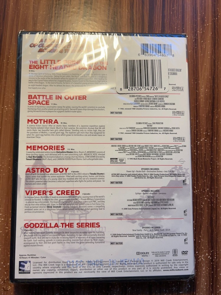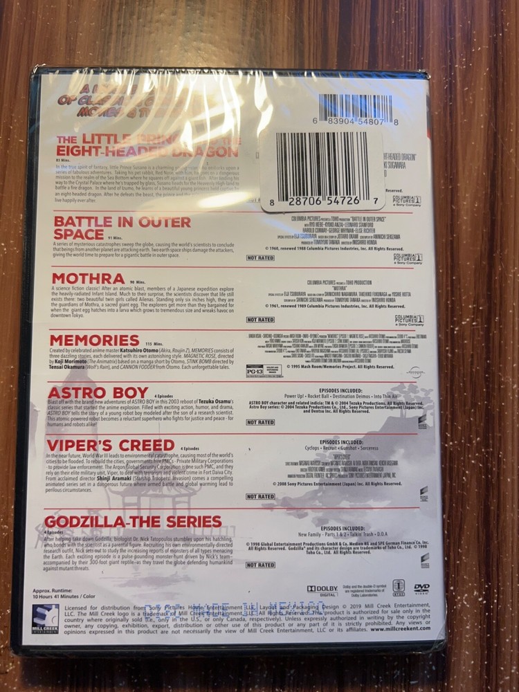 BRAND NEW & FACTORY SEALED! SEE PICTURES FOR FULL DETAILS! 10 + HOURS OF VIEWING PLEASURE! INCLUDES: -THE LITTLE PRINCE AND THE EIGHT HEADED DRAGON -BATTLE IN OUTER SPACE -MOTHRA -MEMORIES -ASTRO BOY (4 EPISODES) -VIPER'S CREED (4 EPISODES) -GODZILLA: THE SERIES (4 EPISODES)