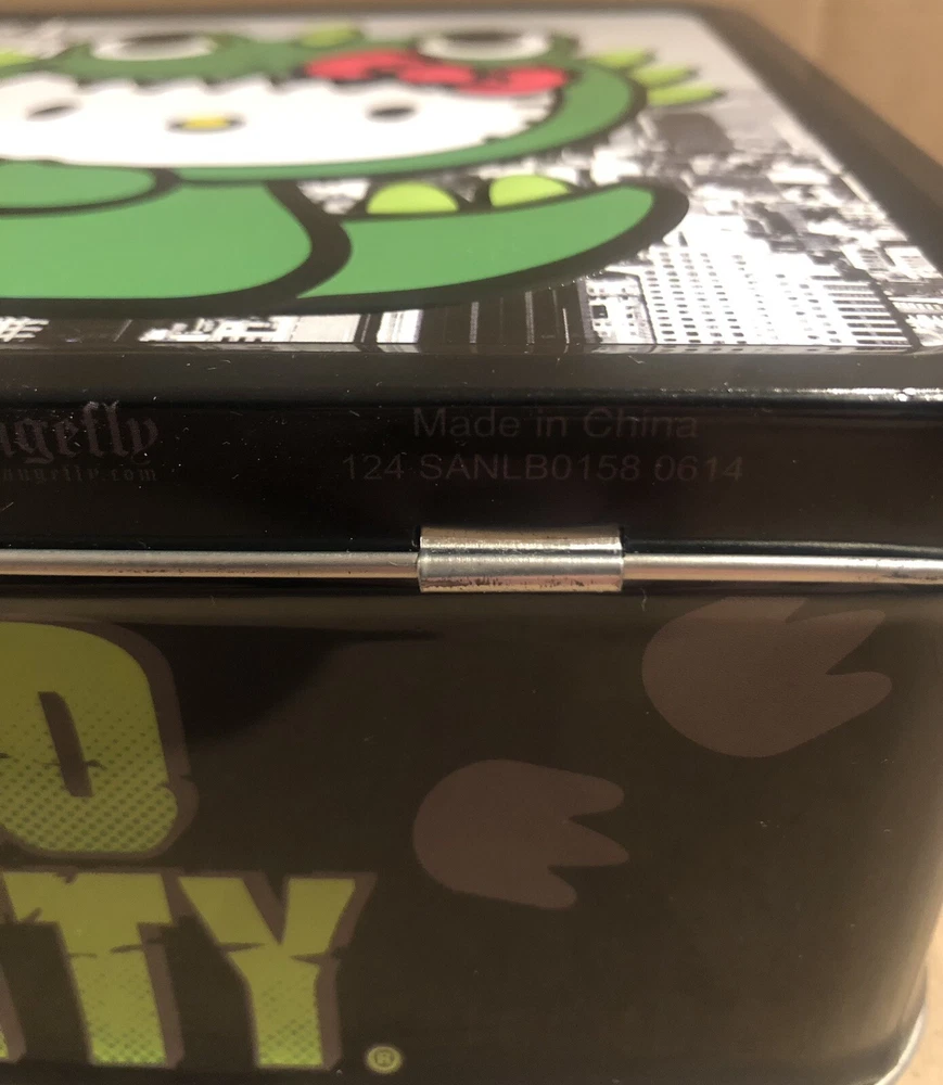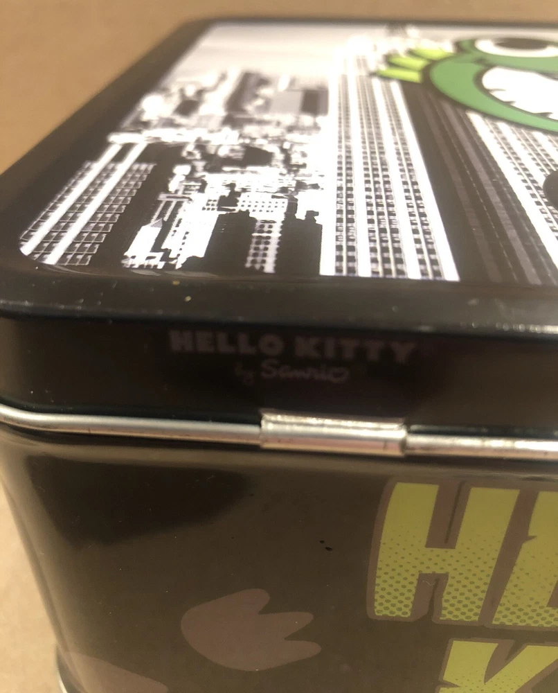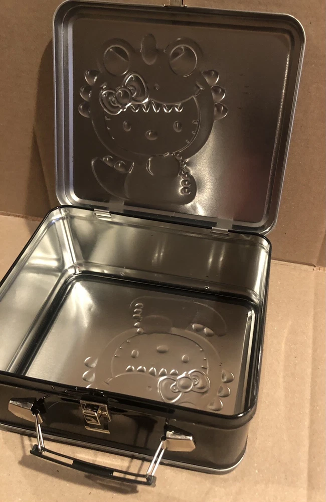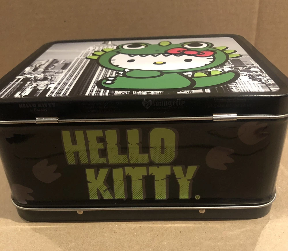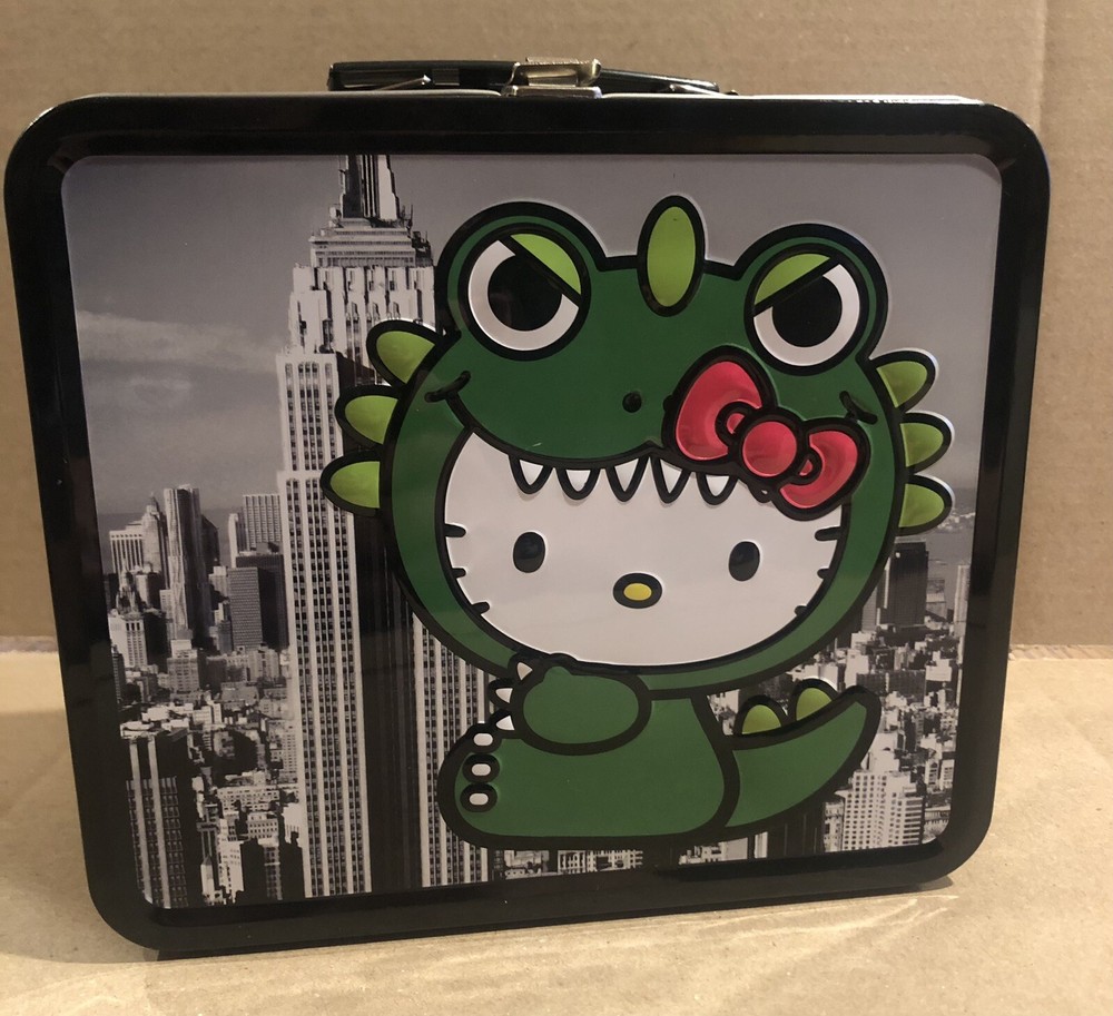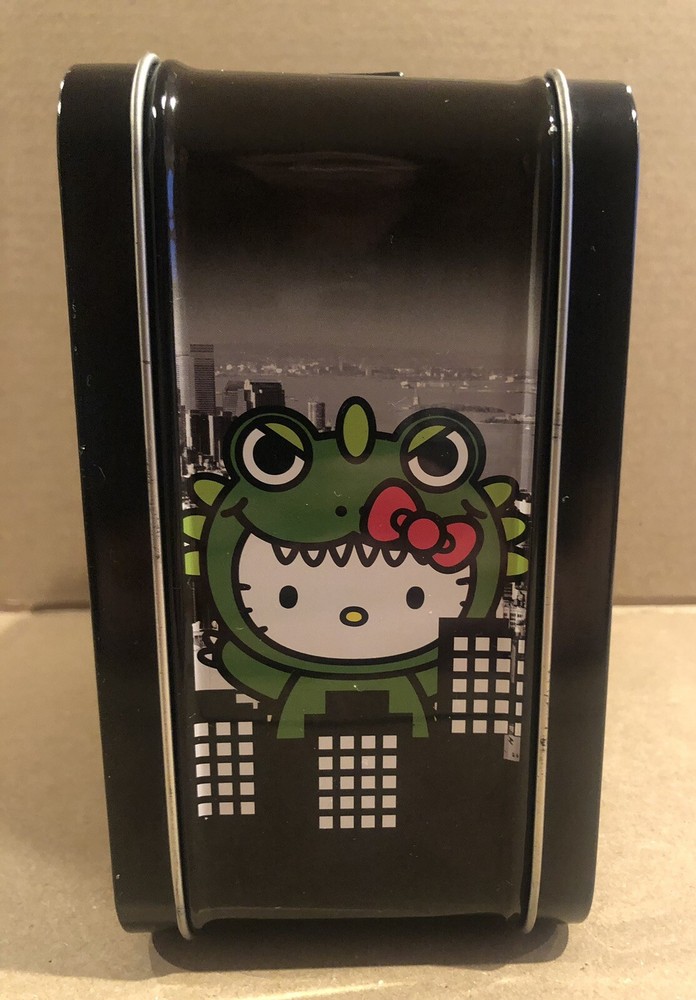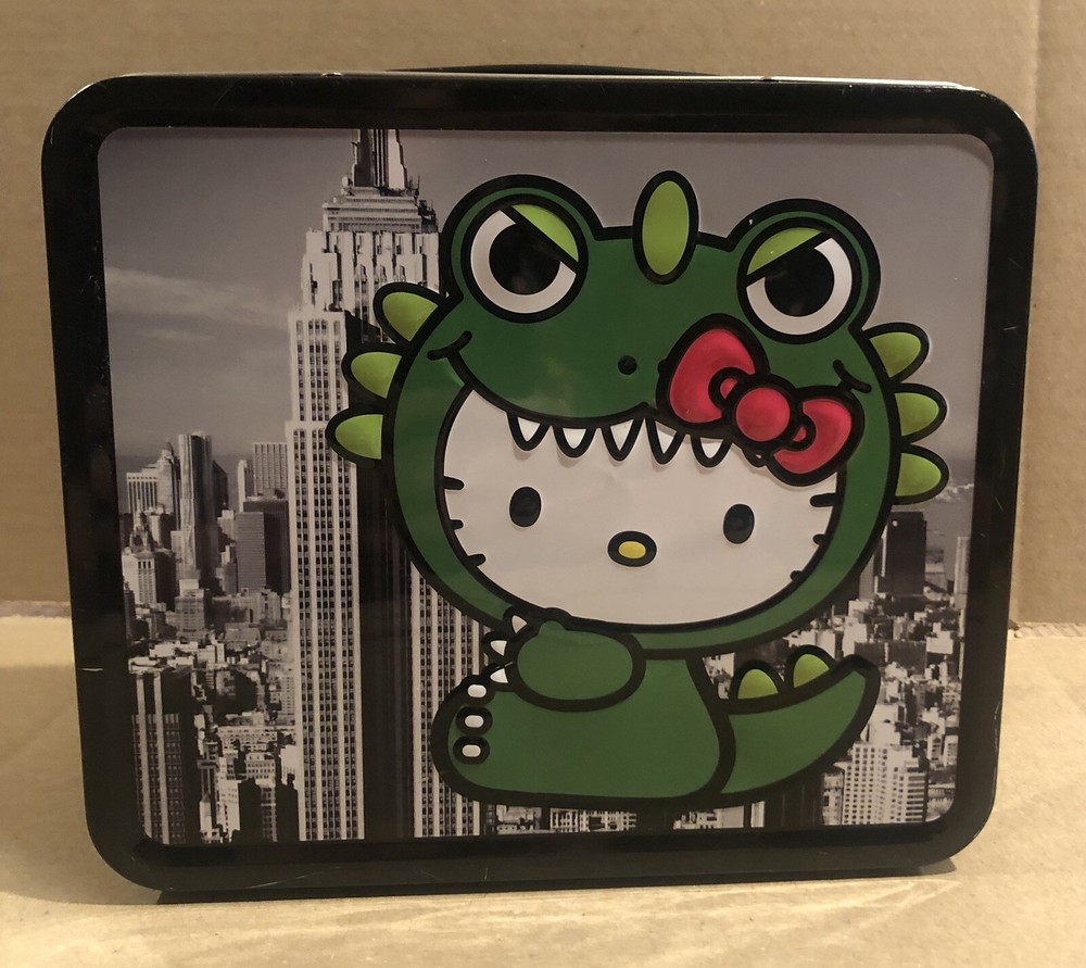 This Sanrio Hello Kitty metal lunch box is a must-have for any fan of the franchise. Featuring a unique design with Hello Kitty as Godzilla, this lunch box is perfect for storing your lunch or displaying as a collectible item. The multicolor design is eye-catching and will make a great addition to any collection. Whether you're a fan of Hello Kitty or Godzilla, this lunch box is sure to impress. Get your hands on it quick! This is a must have for any collector of Sanrio, Hello Kitty or Godzilla. It is in great condition for the age. There is a small scratch inside as seen in the photos and small very unnoticeable spots on the outside as well. Not seen easily with the eye.