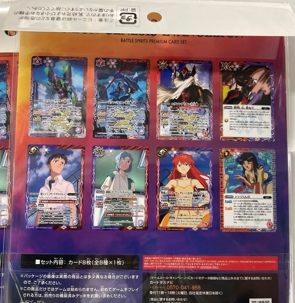 Set Godzilla vs Evangelion + Evangelion Battle Spirits Premium Card Set FedEx Description Condition: New. Japan Version. The product manual is written in Japanese. Japan Version. Release date 2023/12/23 Set of 2 1. Godzilla vs Evangelion Battle Spirits Premium Card Set (PC11) Content : 8 cards 8 types in total (1 piece each) “Godzilla” x “Evangelion” x Battle Spirits dream collaboration! 2.Evangelion Battle Spirits Premium Card Set (PC12) Content : 8 cards 8 types in total (1 piece each) All 8 cards included are luxurious specifications with new designs, new cards, and X rare processing for this set! Payment Please pay within 3 days after the auction closed. Shipping The item will be ship from DHL or FedEx with tracking. Expedited Shipping: About 5 day to arrive after shipping. Note: Shipping to remote areas requires an additional fee. Returns Returns are accepted ONLY if the item was not the item described. International Buyers - Please Note: * Import duties, taxes and charges are not included in the item price or shipping charges. These charges are the buyer's responsibility. * Please check with your country's customs office to determine what these additional costs will be prior to bidding/buying. * These charges are normally collected by the delivering freight (shipping) company or when you pick the item up - do not confuse them for additional shipping charges. * We do not mark merchandise values below value or mark items as "gifts" - US and International government regulations prohibit such behavior.