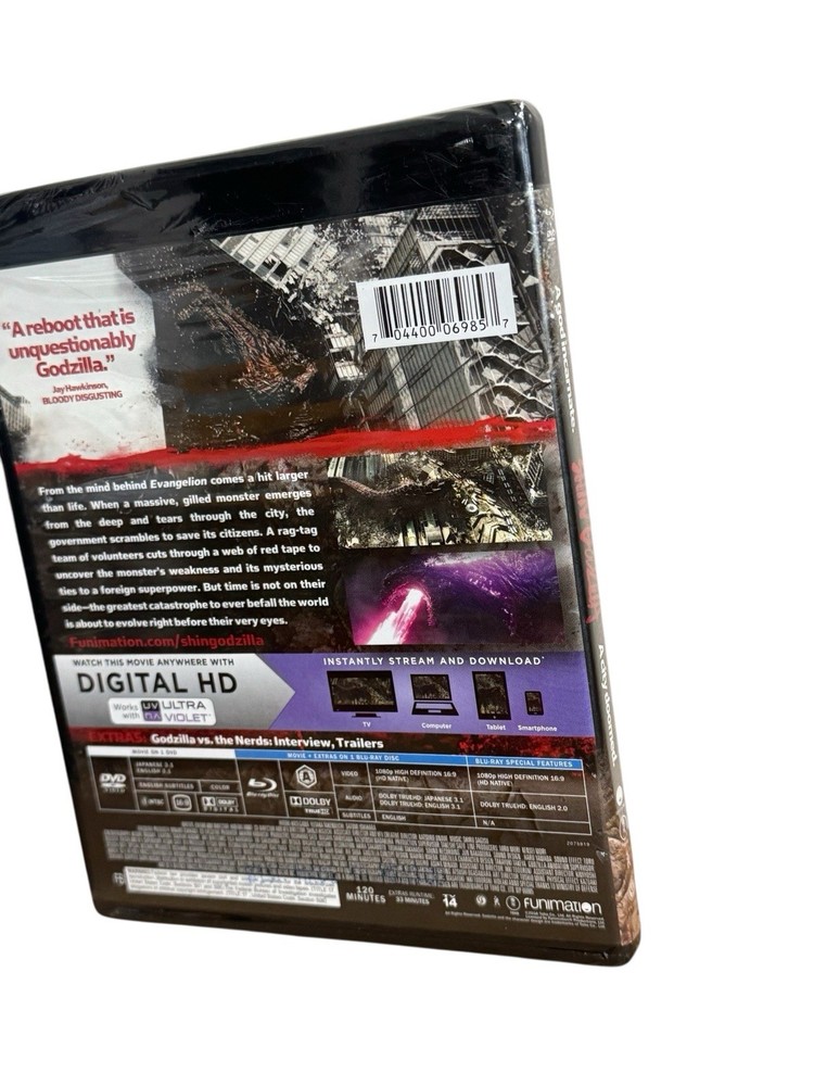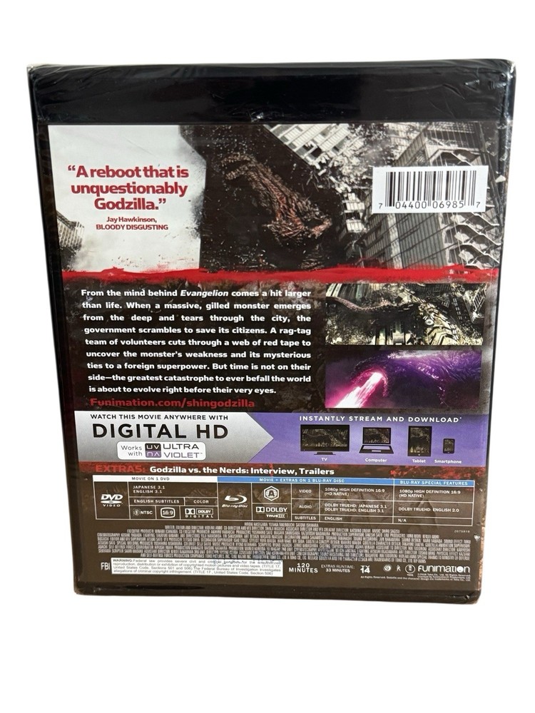"Shin Godzilla 2016 Blu-ray NO Slipcover. Bluray + DVD Combo Toho. OOP Black Case" is a brand new movie release from 2016 in Blu-ray format. It is a foreign-Japanese sci-fi contemporary film under the Godzilla franchise, with a run time of 120 minutes. This edition includes both the Blu-ray and DVD discs in a black Blu-ray case from Funimation Productions.