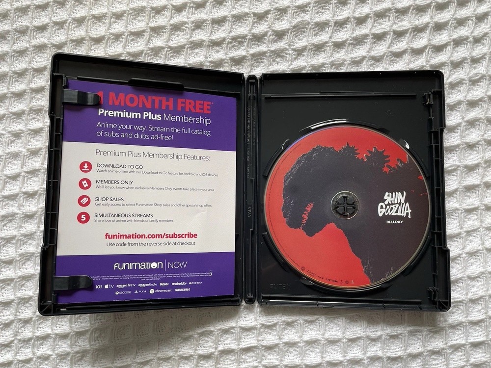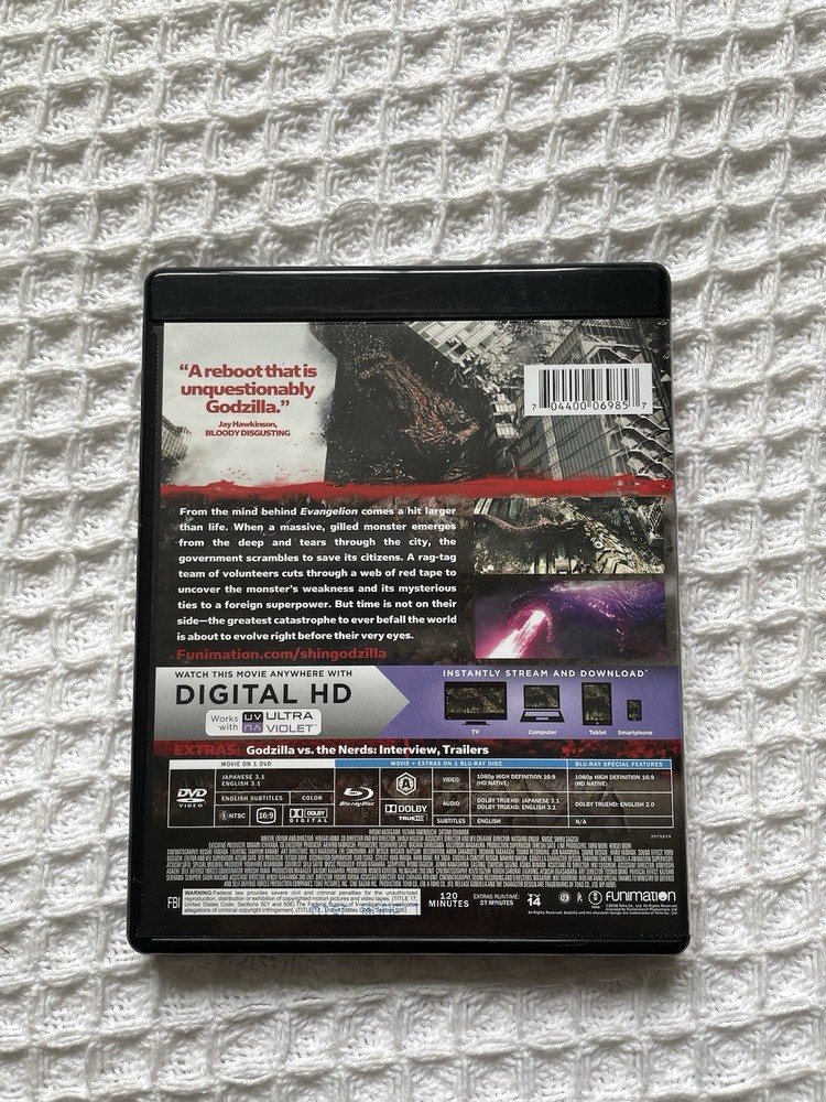 OOP Funimation Blu-ray release of Hideaki Anno’s Shin Godzilla. Blu-ray is in working condition and has been played once before. No slipcover. There is a digital copy code included but I cannot verify that it is still available to redeem. DOES NOT CONTAIN DVD COPY - BLU-RAY ONLY