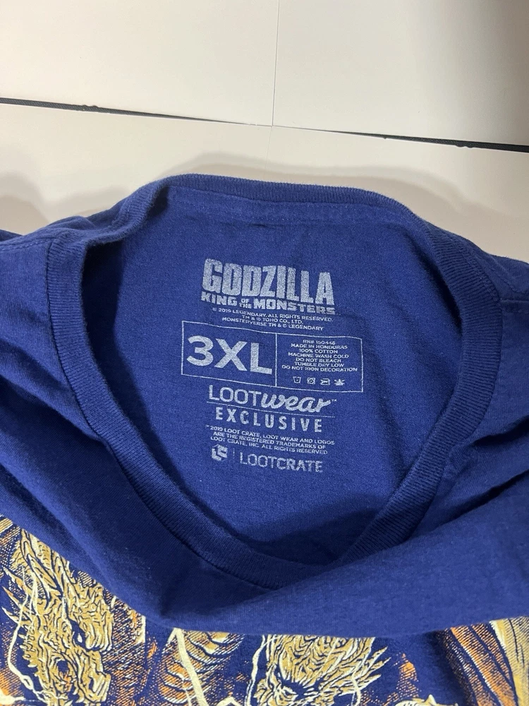 This blue Loot Crate t-shirt features the iconic Godzilla, King of the Monsters, in size 3XL. The shirt is perfect for men who love the classic monster movie character and want to show off their love for him. The shirt is made of high-quality materials and is designed to be comfortable and durable. The blue color of the shirt is perfect for any casual occasion and will make you stand out from the crowd. Get your hands on this limited edition t-shirt today!