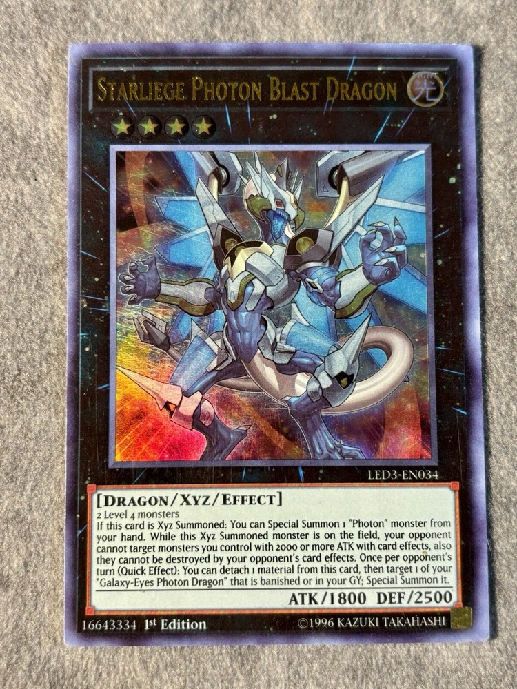 The "Starleige Photon Blast Dragon" card is an Ultra Rare Yu-Gi-Oh! TCG card manufactured by Konami. It features a dragon theme and is part of the Yu-Gi-Oh! franchise. This specific card is in English and is a 1st Edition with the card number LED3-EN034. As an Ultra Rare card, it is highly sought after by collectors and players alike for its rarity and potential gameplay value.