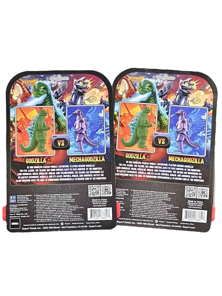 Pics of actual figures you’ll receive Brand new and sealed. Ships same day or next in a box with tracking via USPS This articulated, 3.75" scale Super7 x Stern Pinball x Toho ReAction Figure of Godzilla '84 and Mechagodzilla '74 is inspired by the epic artwork from the Stern Godzilla pinball machine!